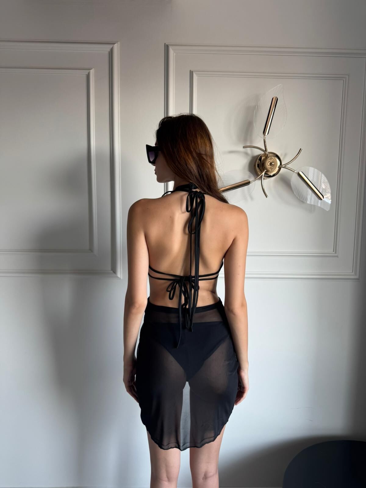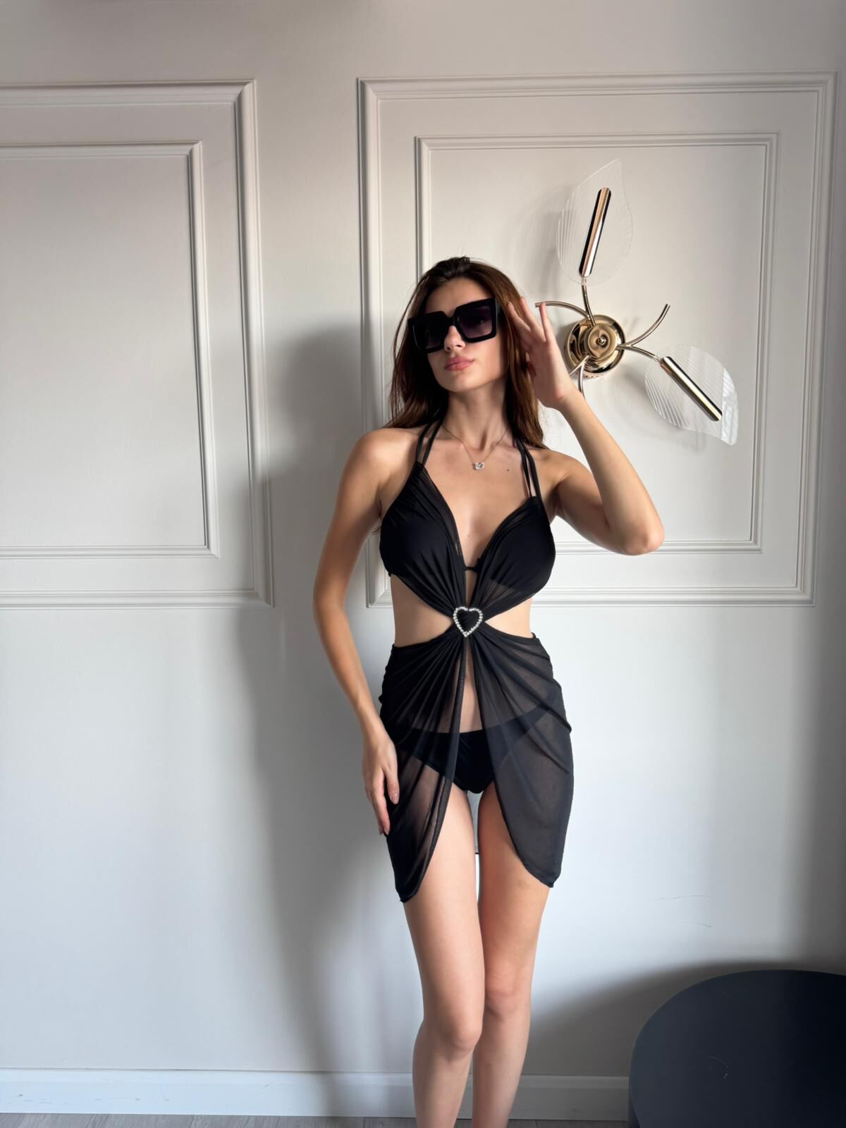 Kadın Tül Pareo Kalp Aksesuarlı Alt ve Üst Bikini 3'lü Takım XS - SİYAH