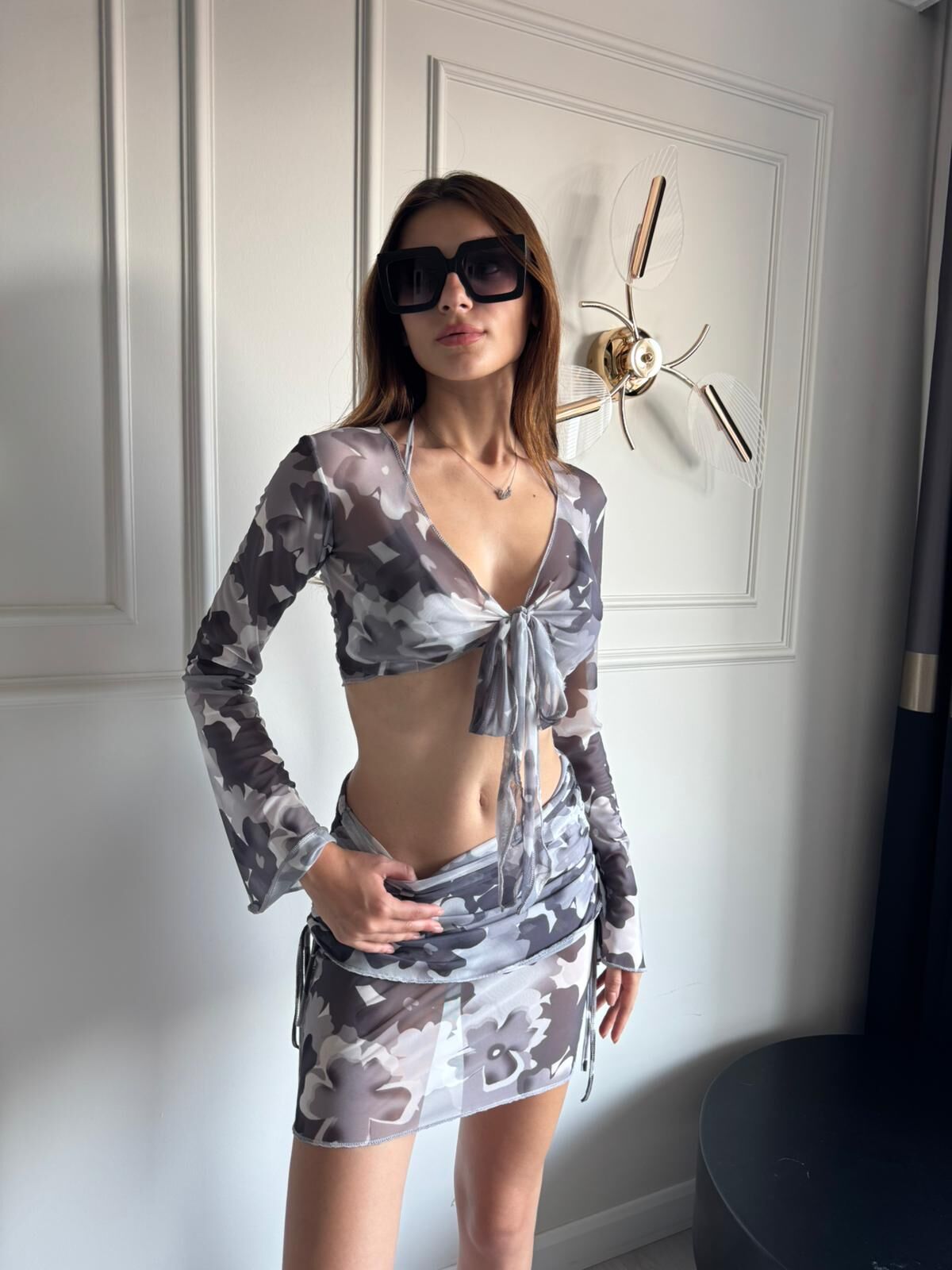Kadın Pareo Etek Üst ve Alt 4'lü Bikini Takım XS - GRİ TONLAR