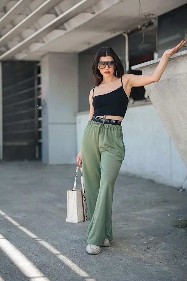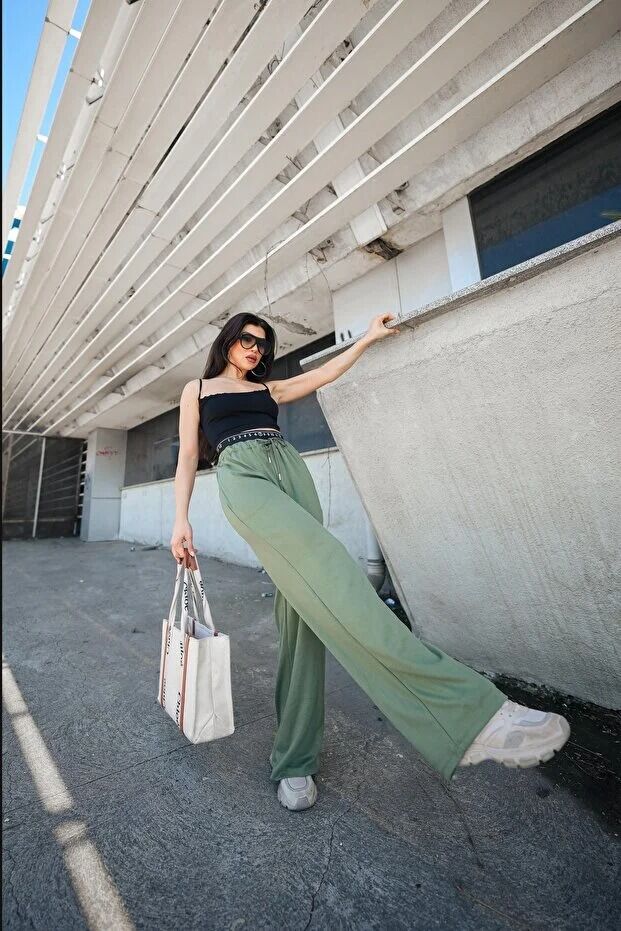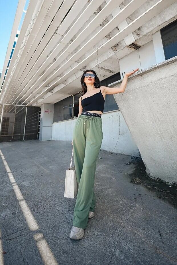 Kadın Günlük ve Spor Bel Lastikl Detaylı Baggy Eşofman Altı Cepli Pantolon L - HAKİ