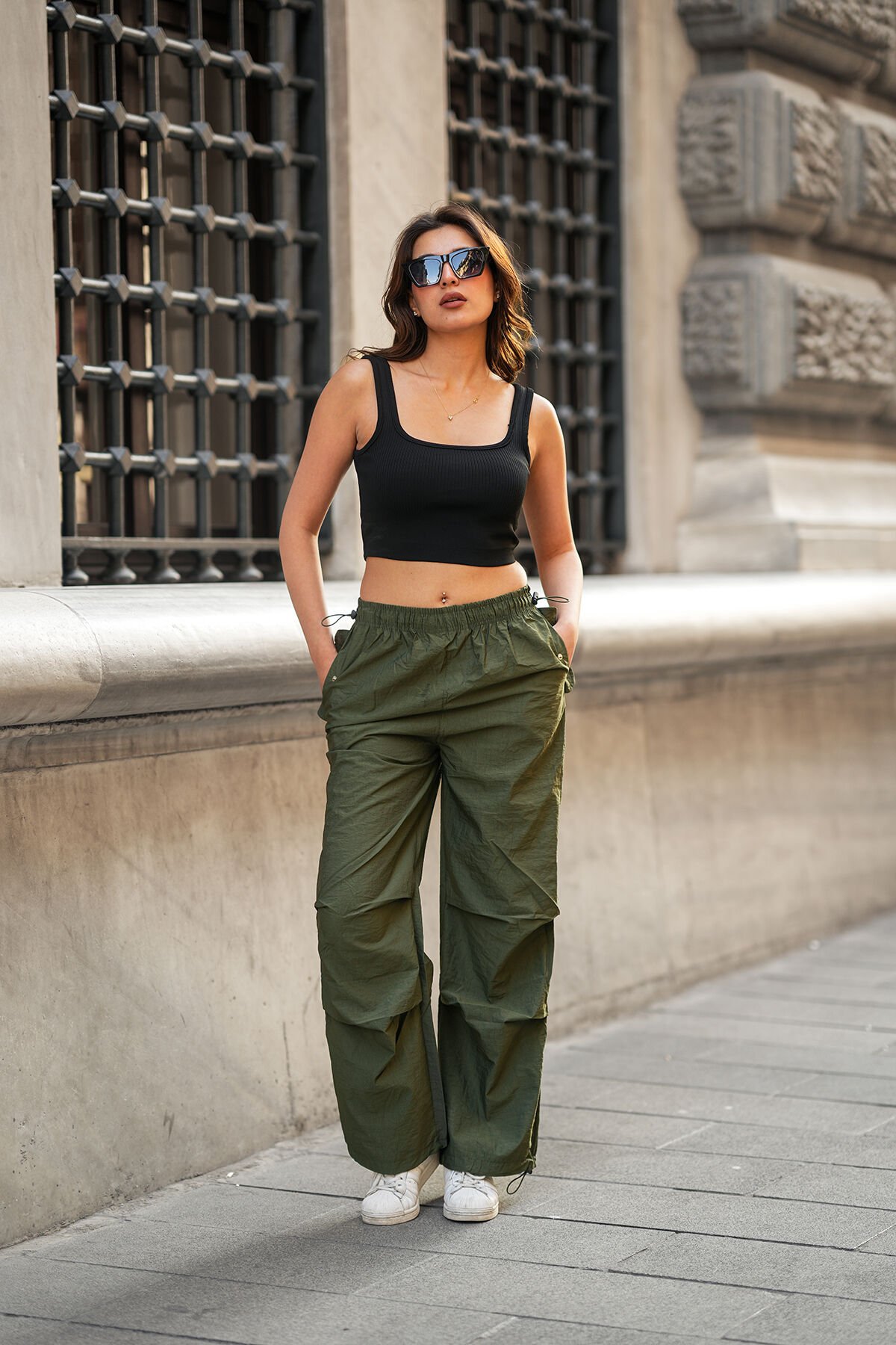 Kadın Bol Paça Lastikli Kullanıla Bilir Cep Kapak Model Baggy Pantolon S - HAKİ