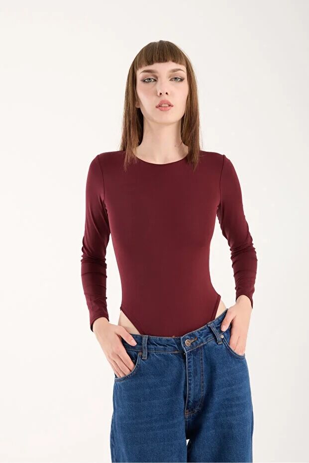 Kadın Bisiklet Yaka Alttan Çıtçıtlı Uzun Kol Body M - BORDO