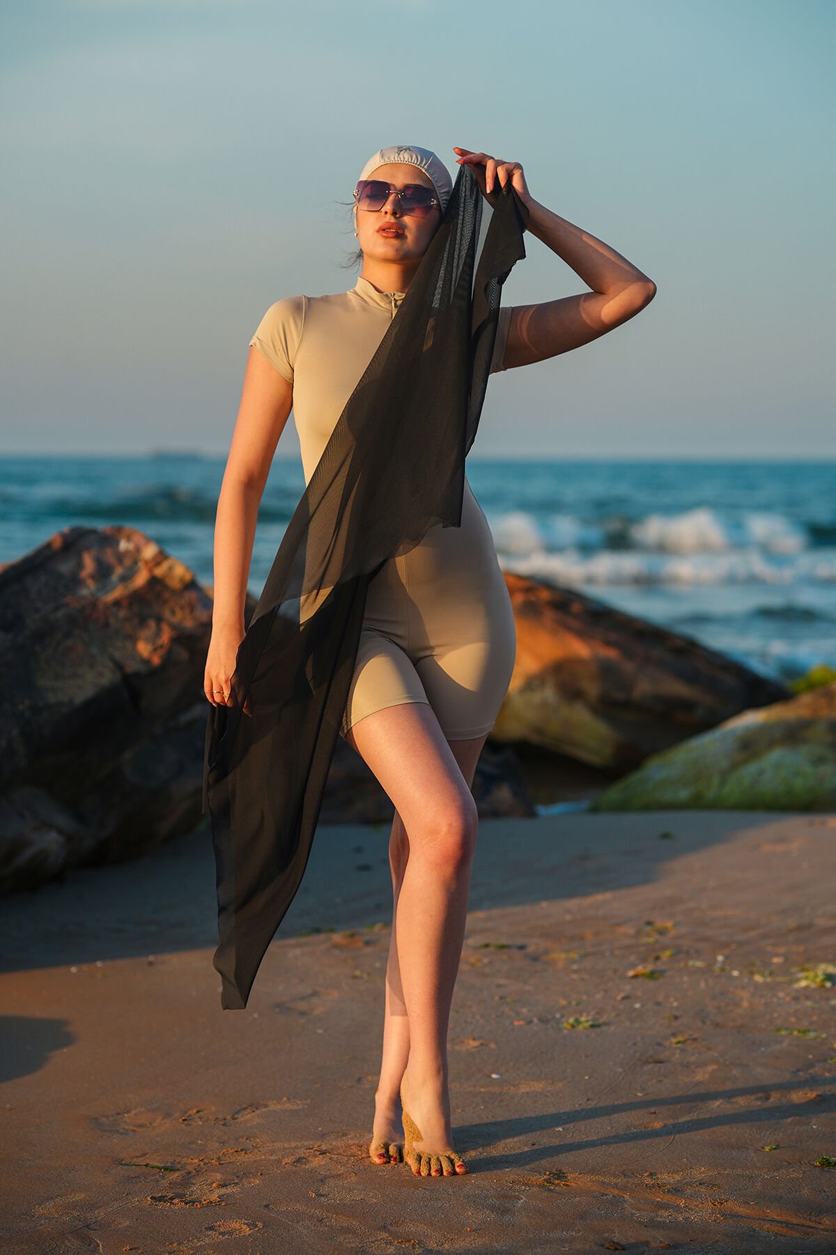 Kadın Kısa Tulum Boneli Tayt Model Tulum Mayo 2XL - BEJ