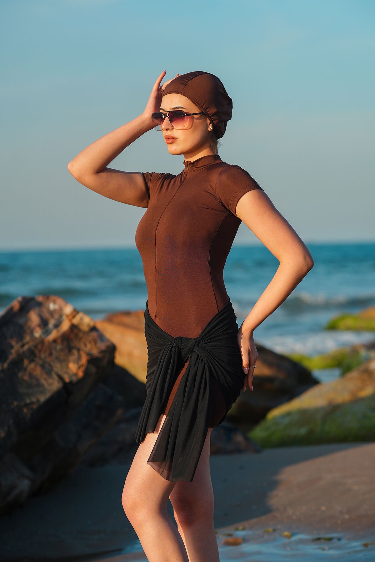 Kadın Kısa Tulum Boneli Tayt Model Tulum Mayo L - KAHVERENGİ