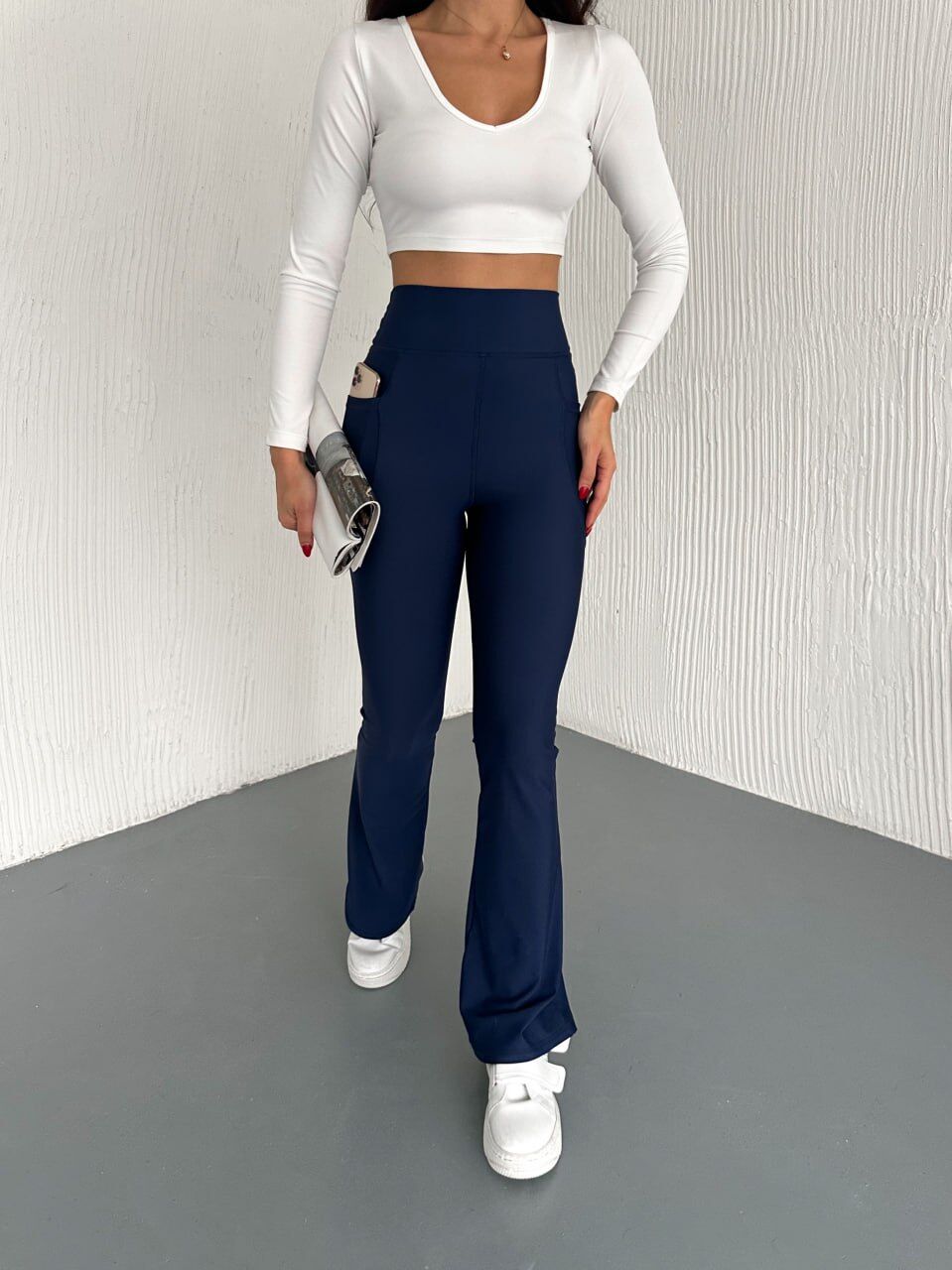 Lacivert rengi ve İspanyol paça – wide leg siluet tasarımı ile hem spor kombinlerde hem de günlük şıklıkta kolayca kullanılabilir. Sportswear koleksiyonunun parçası olan bu tayt, trend görünüme önem veren ve aynı zamanda konfor arayan kullanıcılar için idealdir.