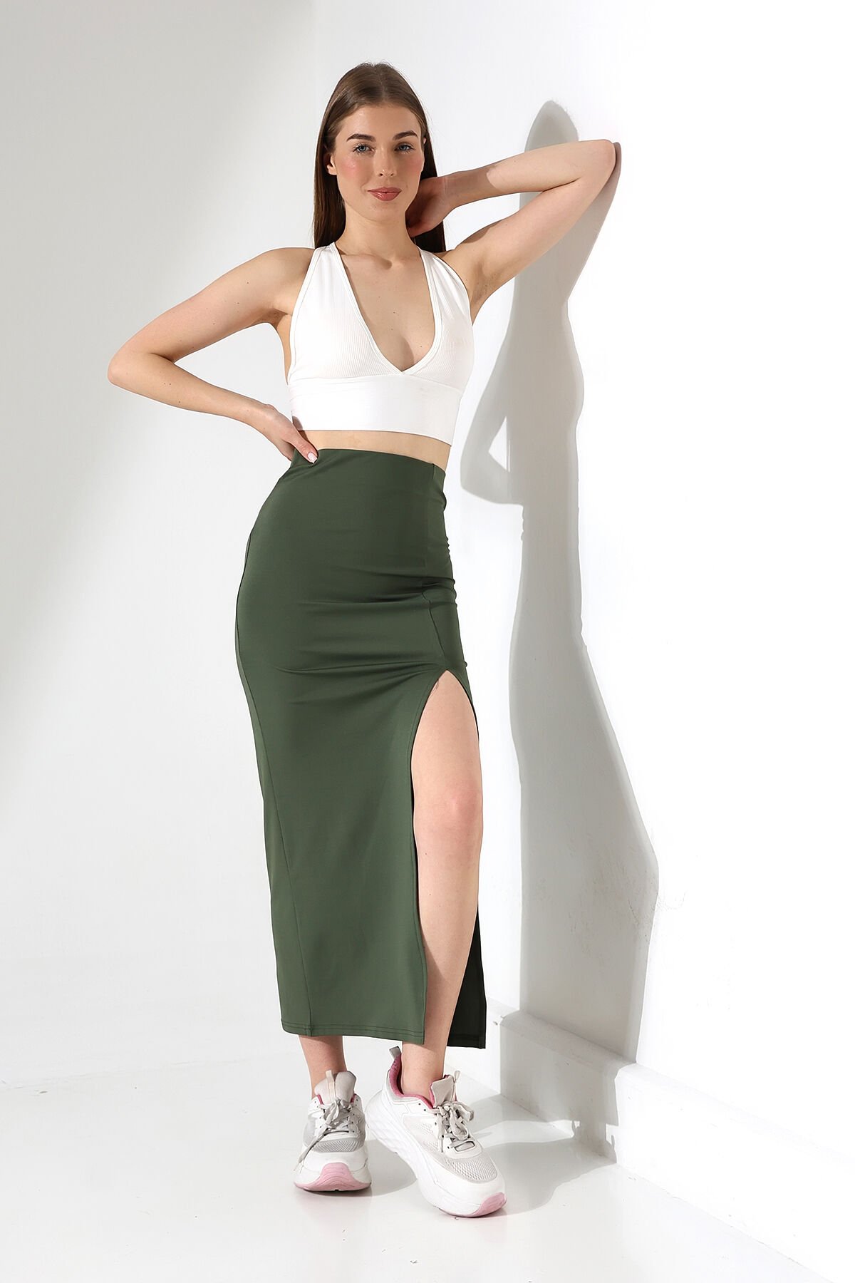 Kadın Maxi Boy 92cm Dalgıç Kumaş ve Yırtmaçlı Uzun Etek WM XL - HAKİ