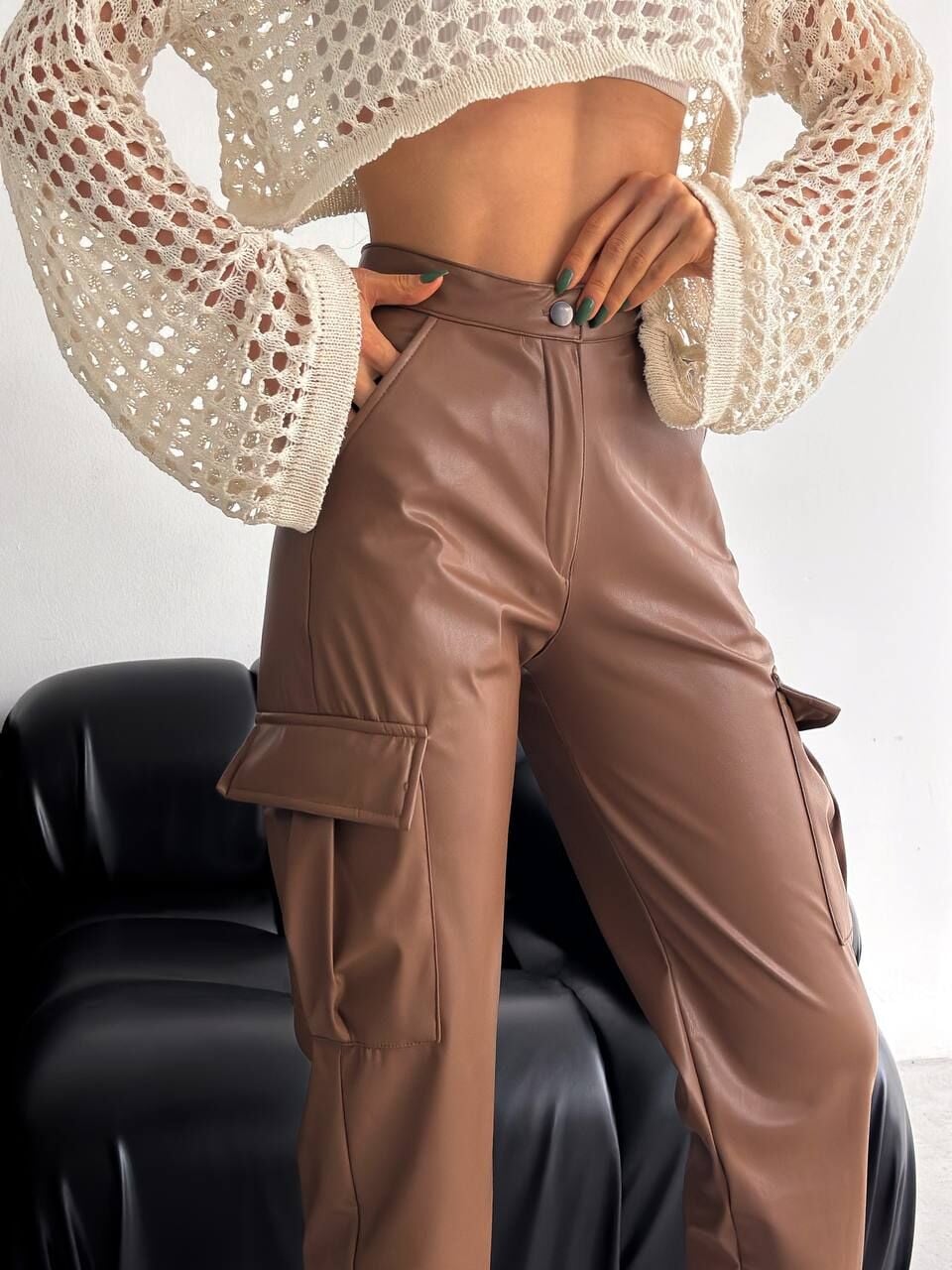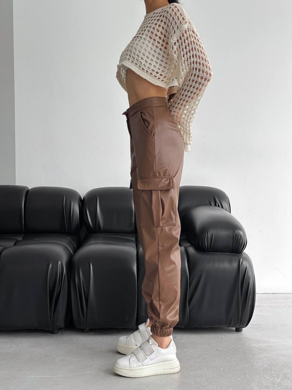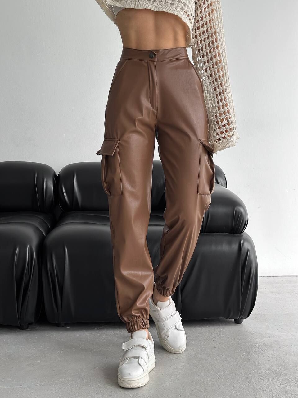 Kadın Deri Yan Kargo Cepli Pantolon 6103 L - KAHVERENGİ