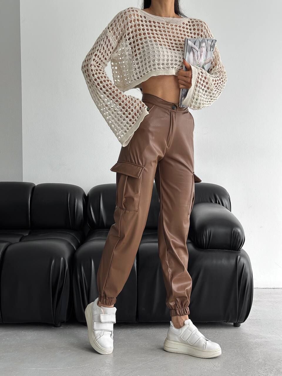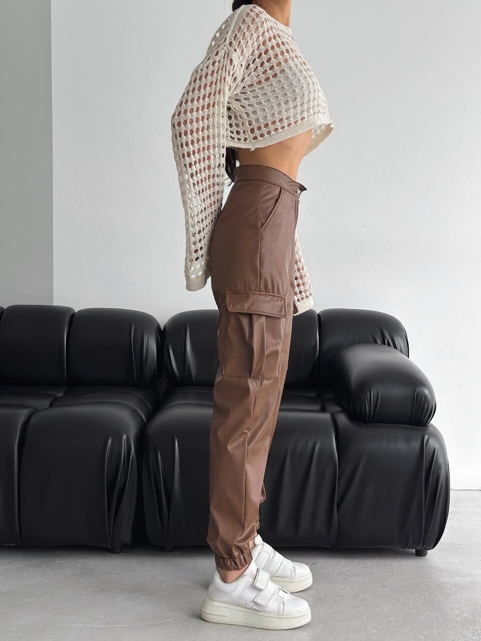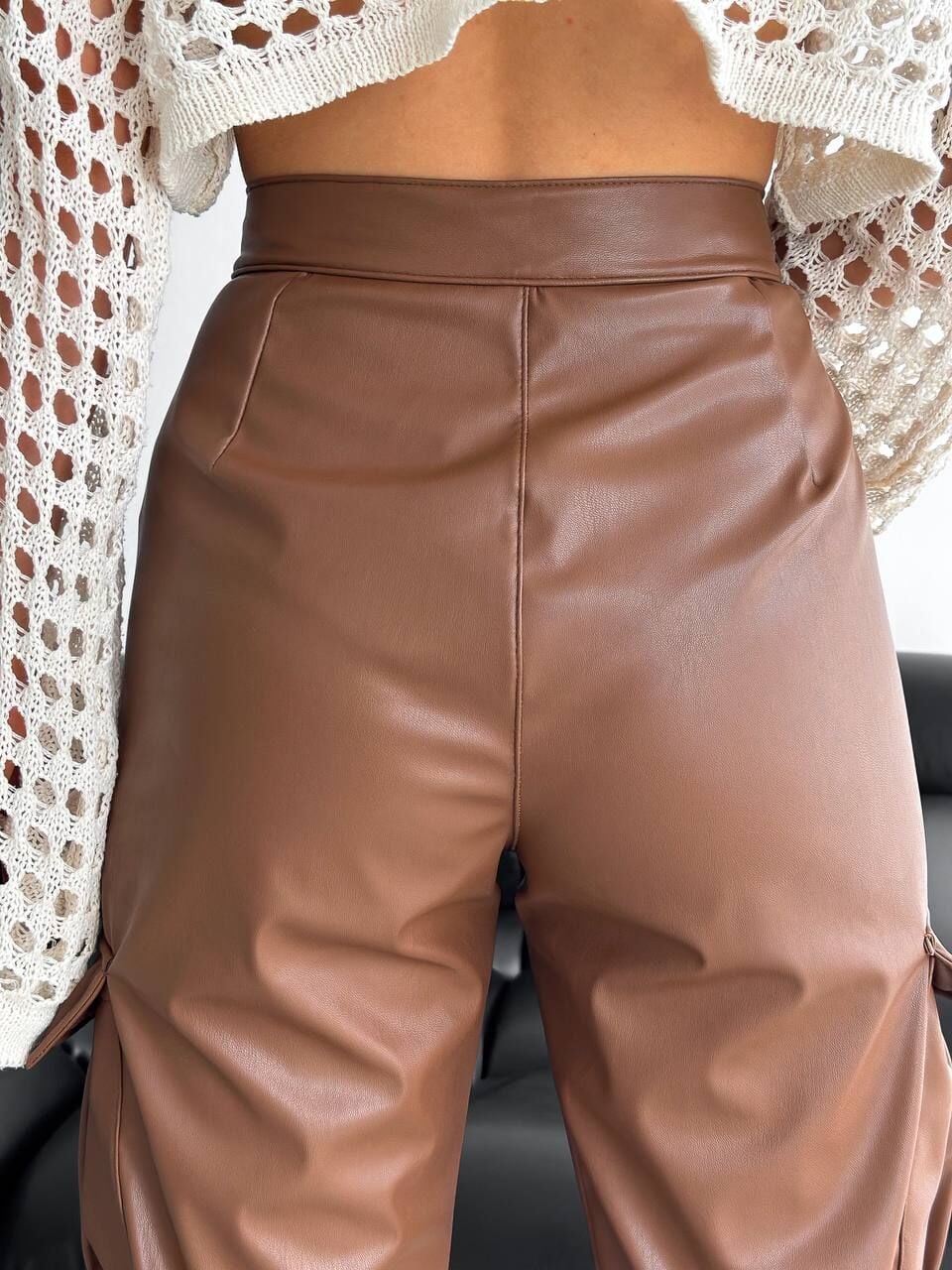 Kadın Deri Yan Kargo Cepli Pantolon 6103 L - KAHVERENGİ