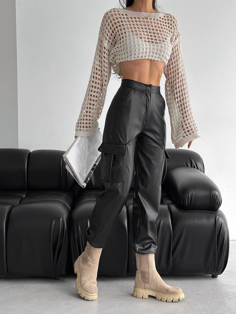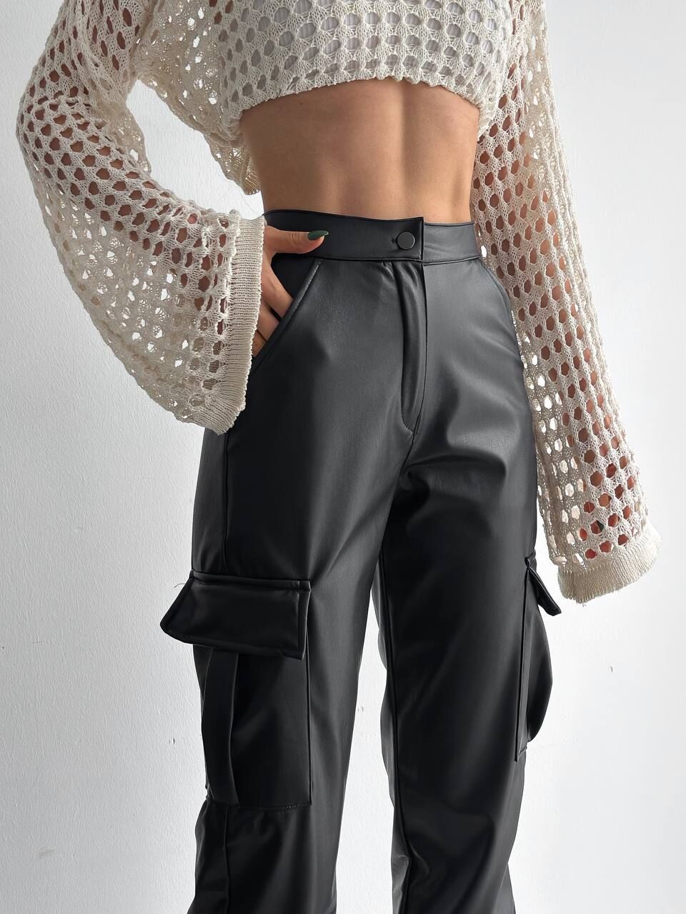 Kadın Deri Yan Kargo Cepli Pantolon 6103 L - SİYAH