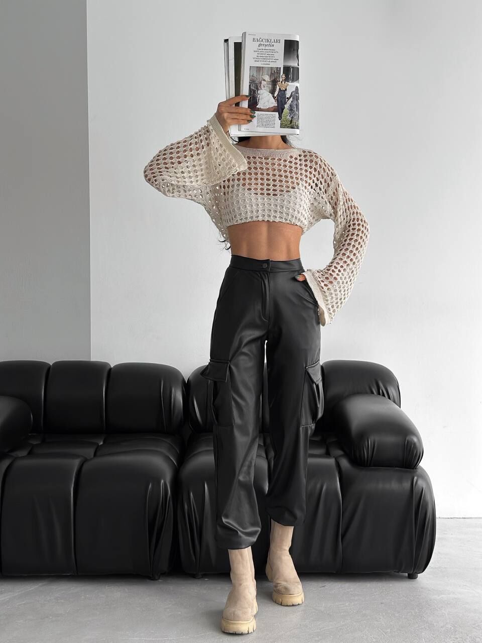 Yandan kargo cepli tasarımıyla öne çıkan kadın suni deri pantolon modeli, modern ve fonksiyonel detayları bir araya getirerek şık bir görünüm sunar. Lastikli paça formu sayesinde rahat bir hareket alanı sağlarken yüksek bel tasarımı vücut hatlarını zarifçe sarar. Esnek yapıda olan suni deri kumaş, gün boyu konfor sunarken trend duruşuyla gardırobun olmazsa olmaz parçaları arasında yer alır.