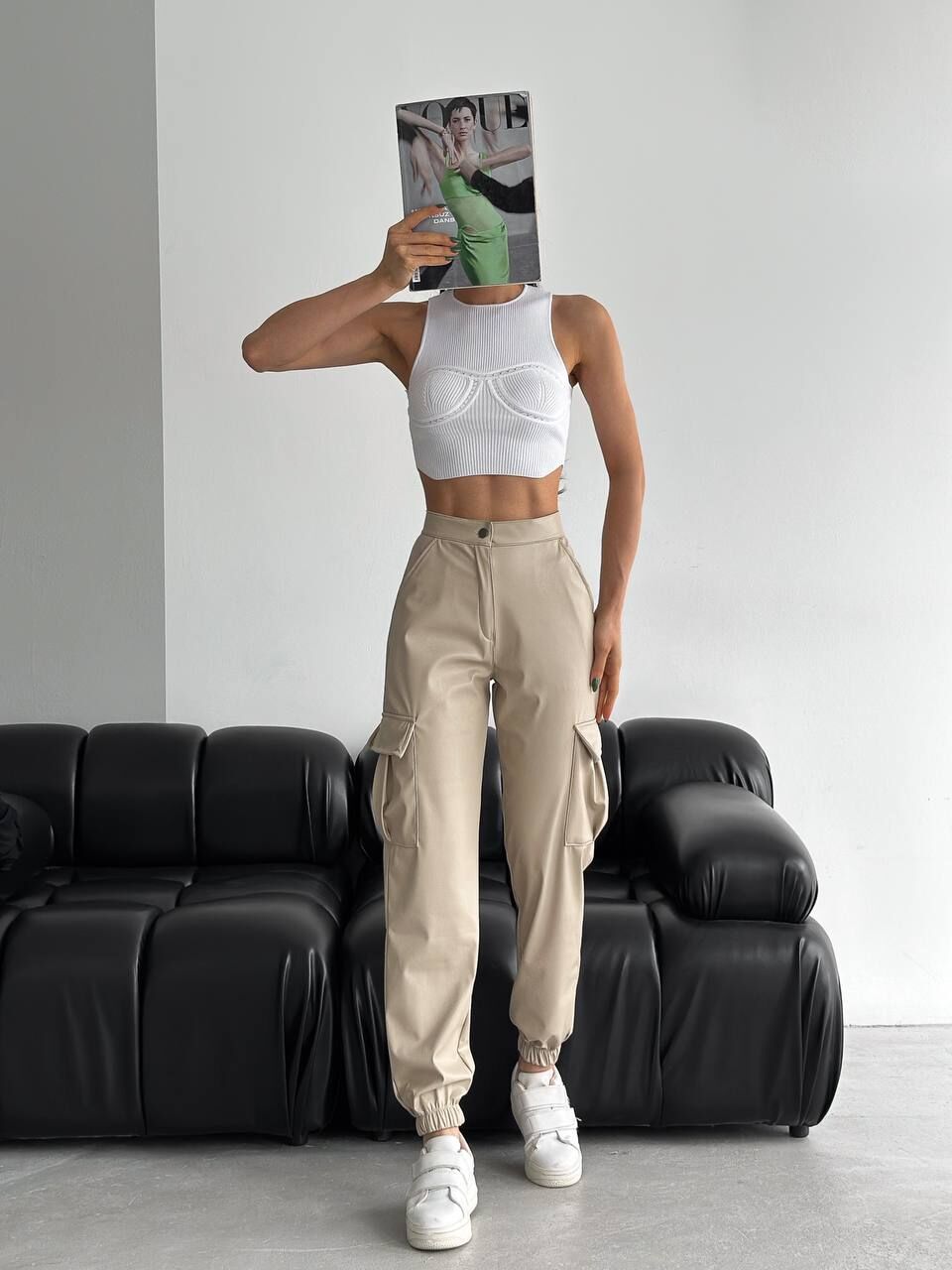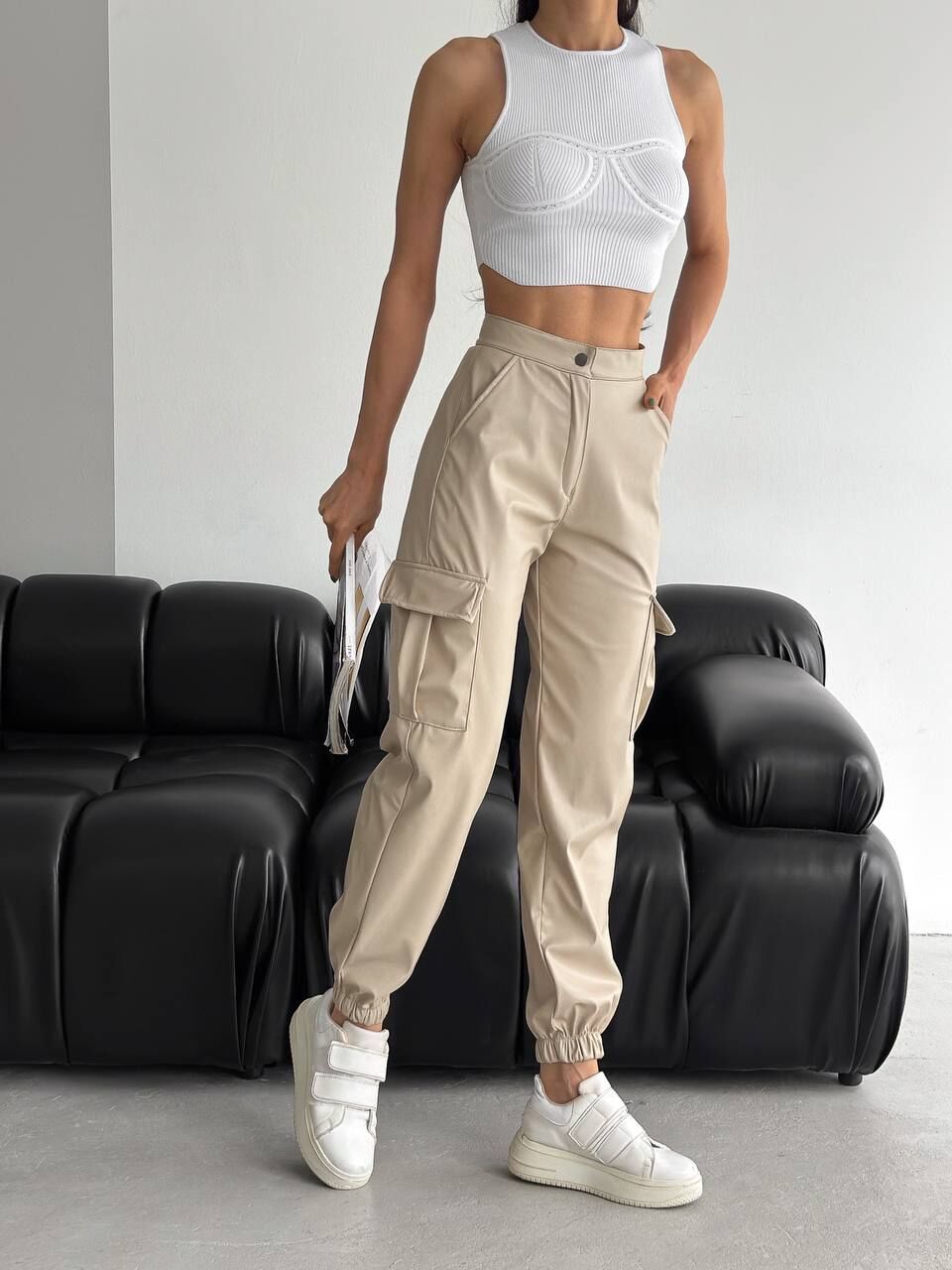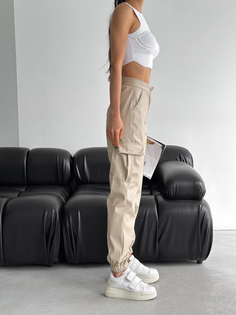 Yandan kargo cepli tasarımıyla öne çıkan kadın suni deri pantolon modeli, modern ve fonksiyonel detayları bir araya getirerek şık bir görünüm sunar. Lastikli paça formu sayesinde rahat bir hareket alanı sağlarken yüksek bel tasarımı vücut hatlarını zarifçe sarar. Esnek yapıda olan suni deri kumaş, gün boyu konfor sunarken trend duruşuyla gardırobun olmazsa olmaz parçaları arasında yer alır.