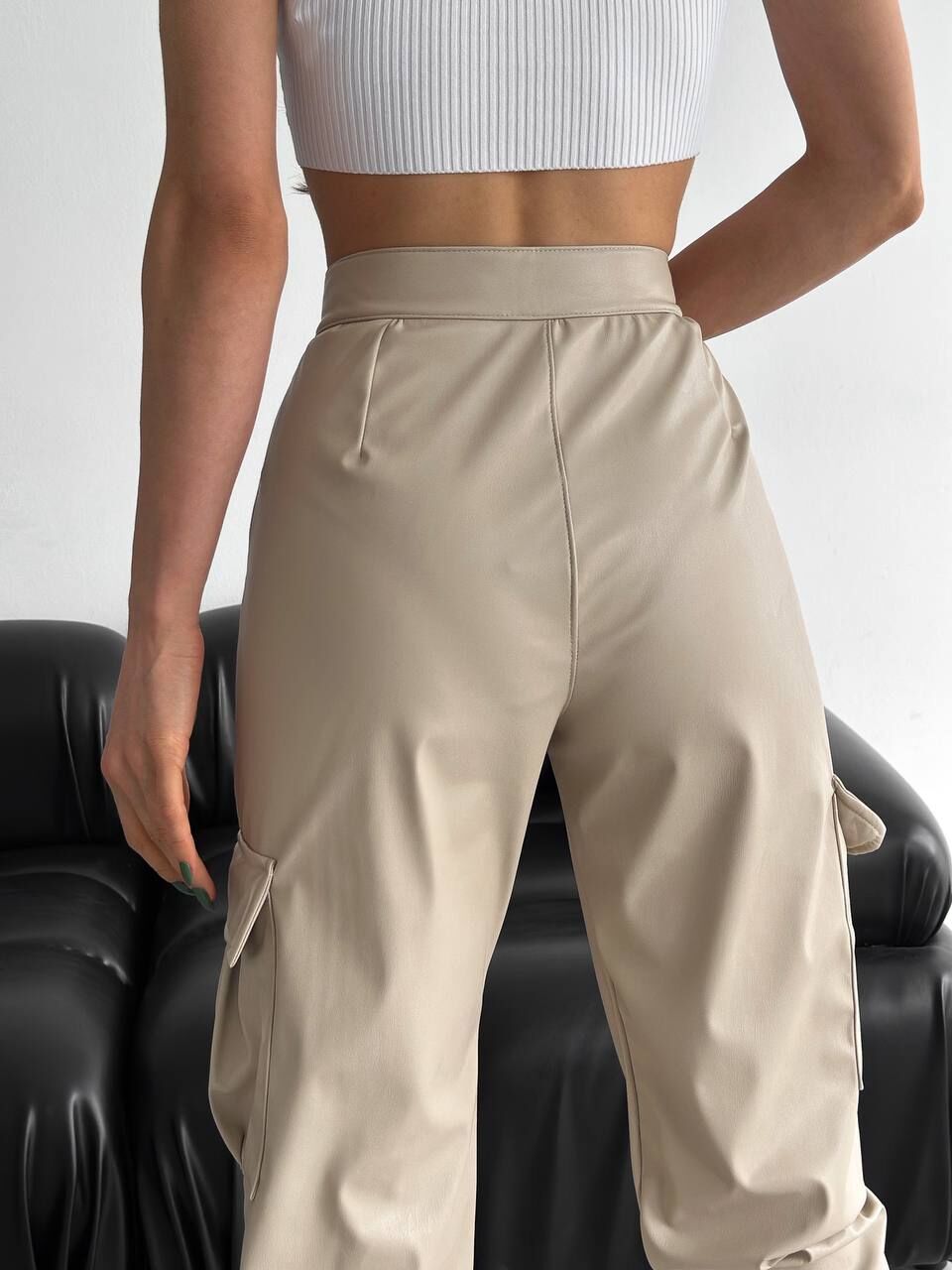 Kadın Deri Yan Kargo Cepli Pantolon 6103 XL - EKRU
