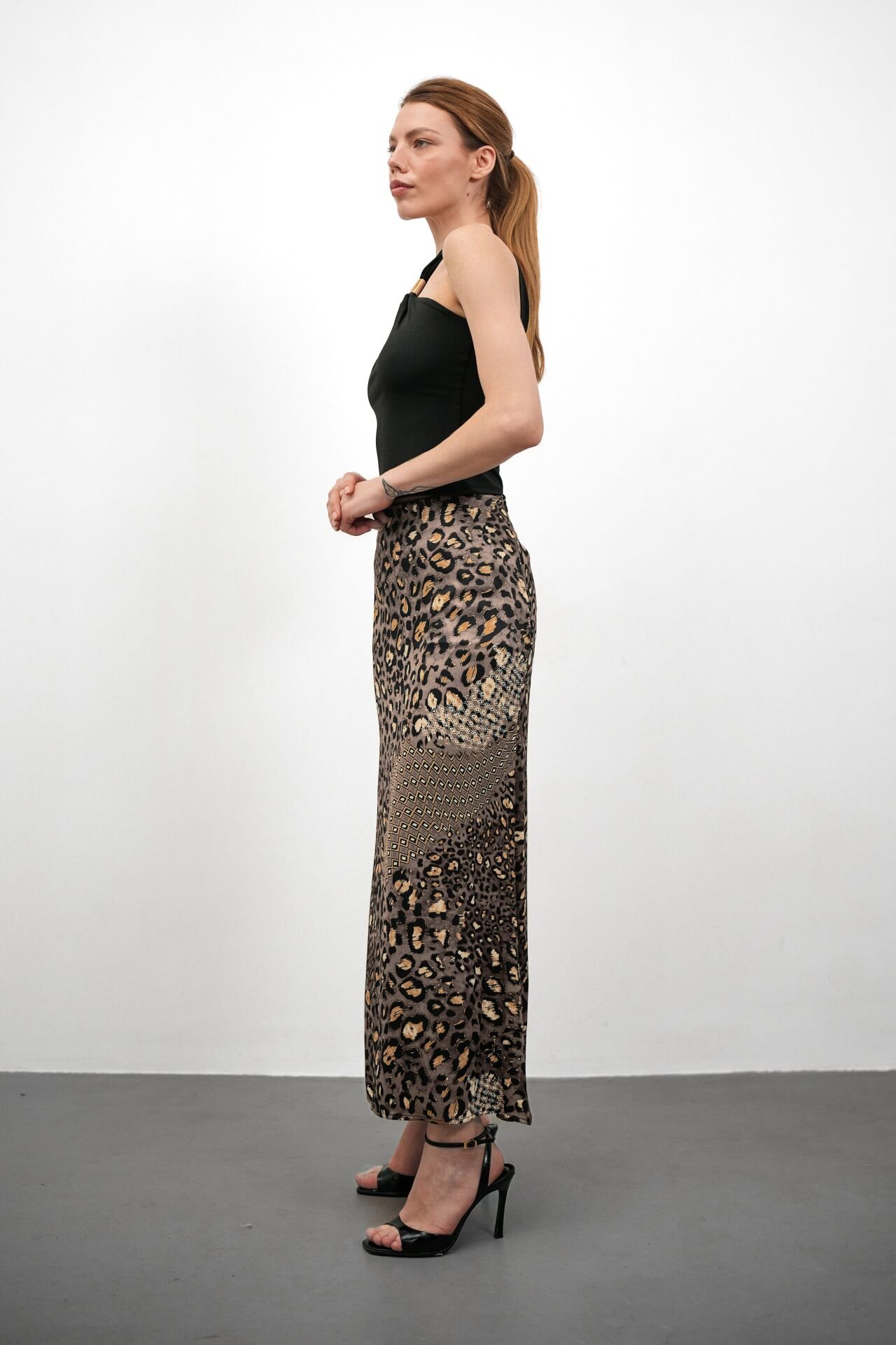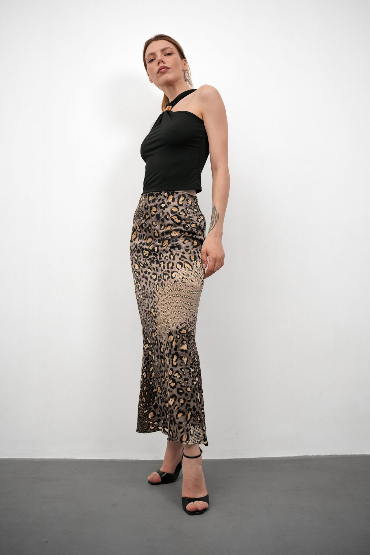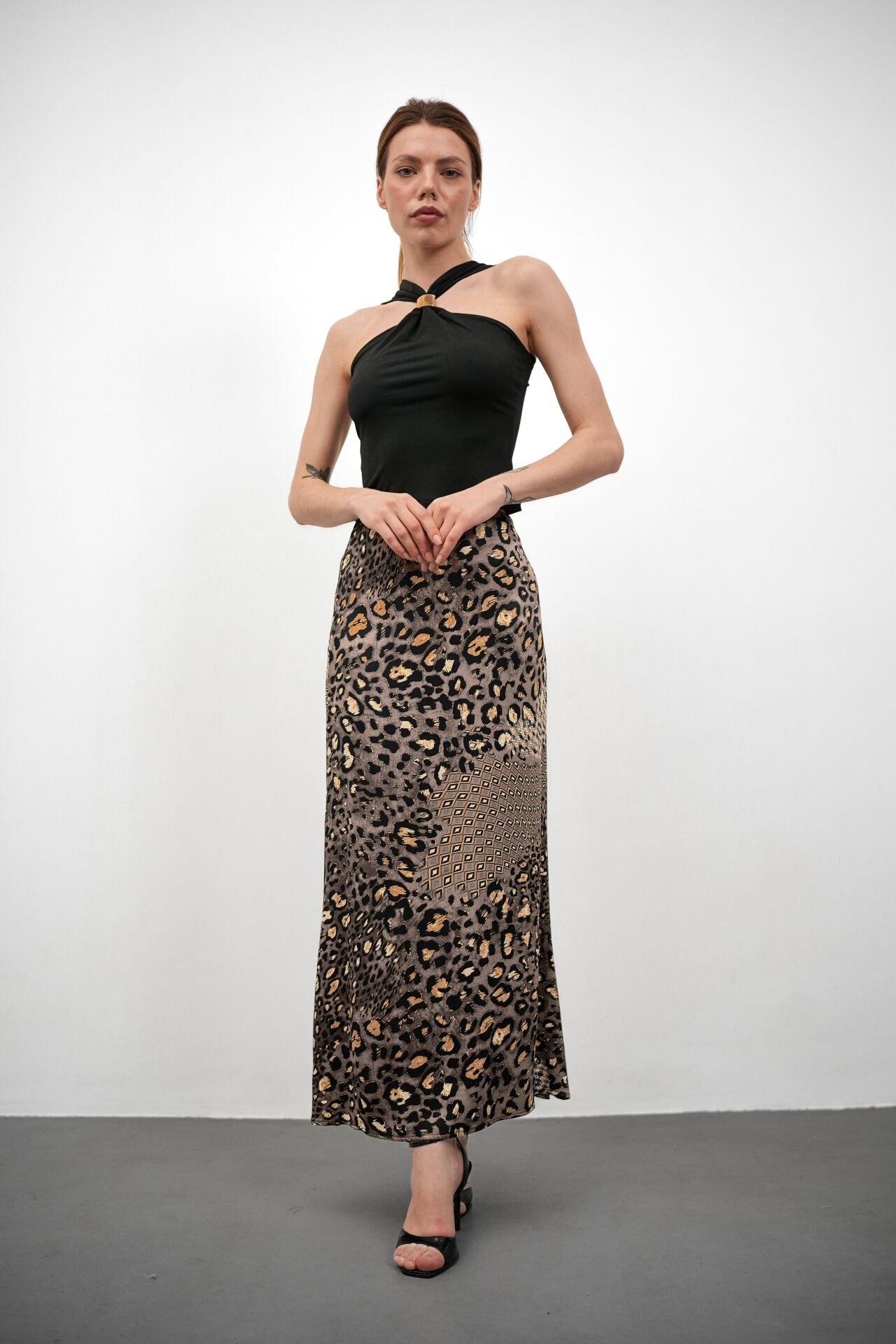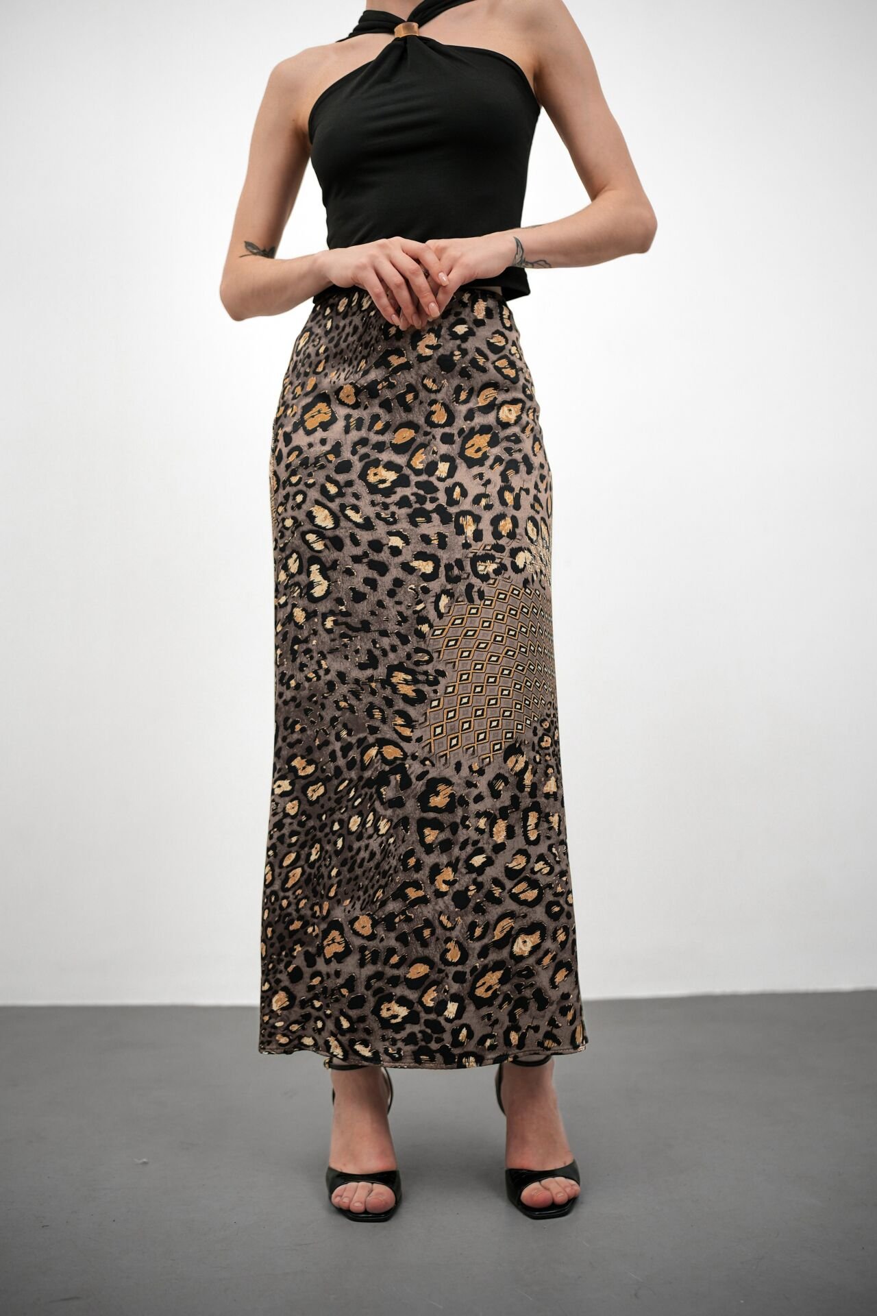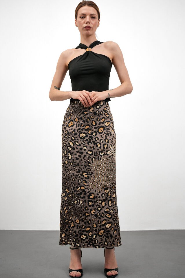 Kadın Uzun Desenli Saten Etek 3XL - KOD-6 GRİ LEOPAR