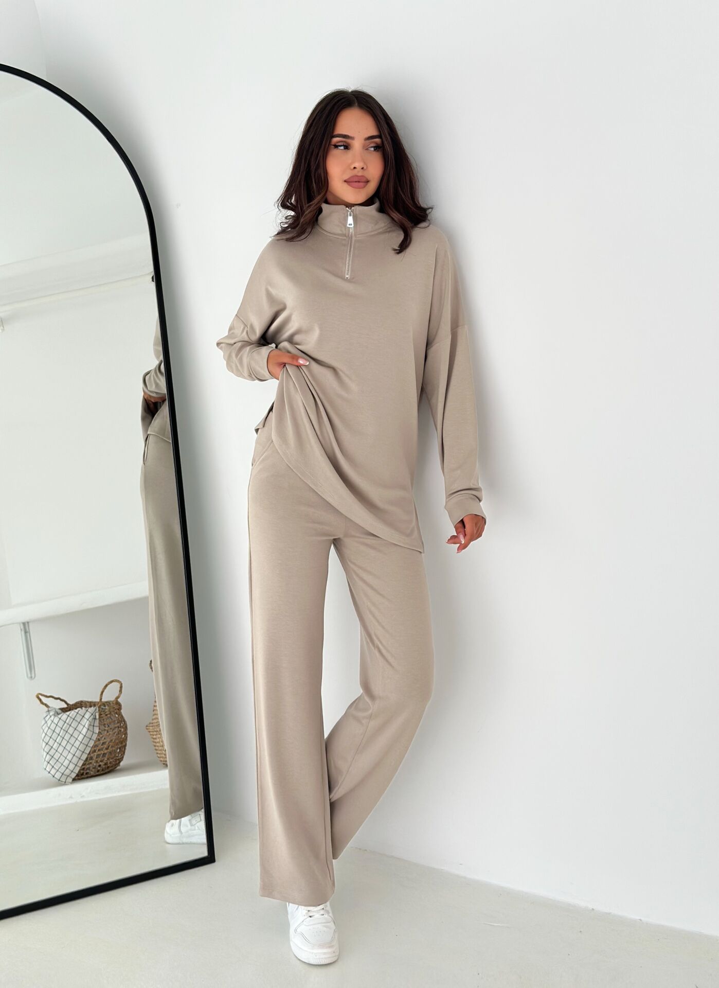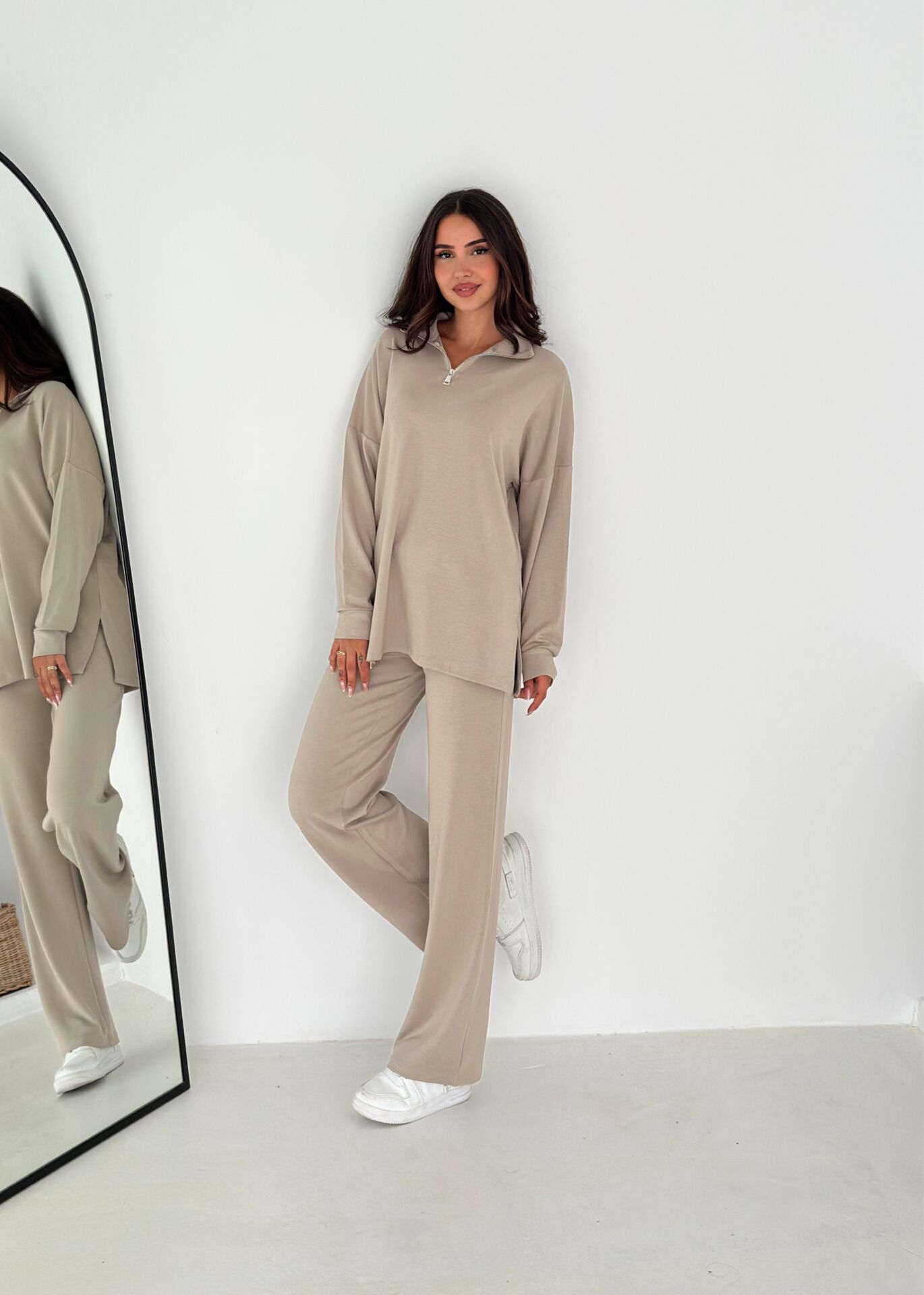 Dik yaka fermuarlı üst ve geniş paça baggy kesim alt parçadan oluşan kadın eşofman takımı, salaş görünümüyle modern ve konforlu bir stil sunar. Modal karışımlı örme kumaşı sayesinde yumuşak, nefes alabilir ve mevsimlik kullanıma son derece uygundur. Yüksek bel kesimi ve çift cepli fonksiyonel tasarımı günlük kullanım için ideal bir rahatlık sağlar. Fermuarlı sweatshirt üst parçası, pratik giyme–çıkarma kolaylığı sunarken lastikli kapama şekli konforu artırır. Relaxed kesimi, hareket özgürlüğü sağlarken geniş paça alt kısmı modern bir siluet oluşturur. Düz desenli sade görünümü hem günlük stil hem de minimal kombinler için ideal hale getirir. %55 modal, %38 polyester ve %7 likra karışımıyla üretilen bu takım dayanıklılık ve konfor arasında mükemmel bir denge kurar. Tesettür giyim uyumlu formuyla şıklığı ve rahatlığı bir arada isteyen kadınlar için özel olarak tasarlanmıştır. Winmoda güvencesiyle sunulan kadın eşofman takımı, dört mevsim kullanılabilir yapısıyla gardırobun vazgeçilmez parçalarından biri olmaya adaydır.