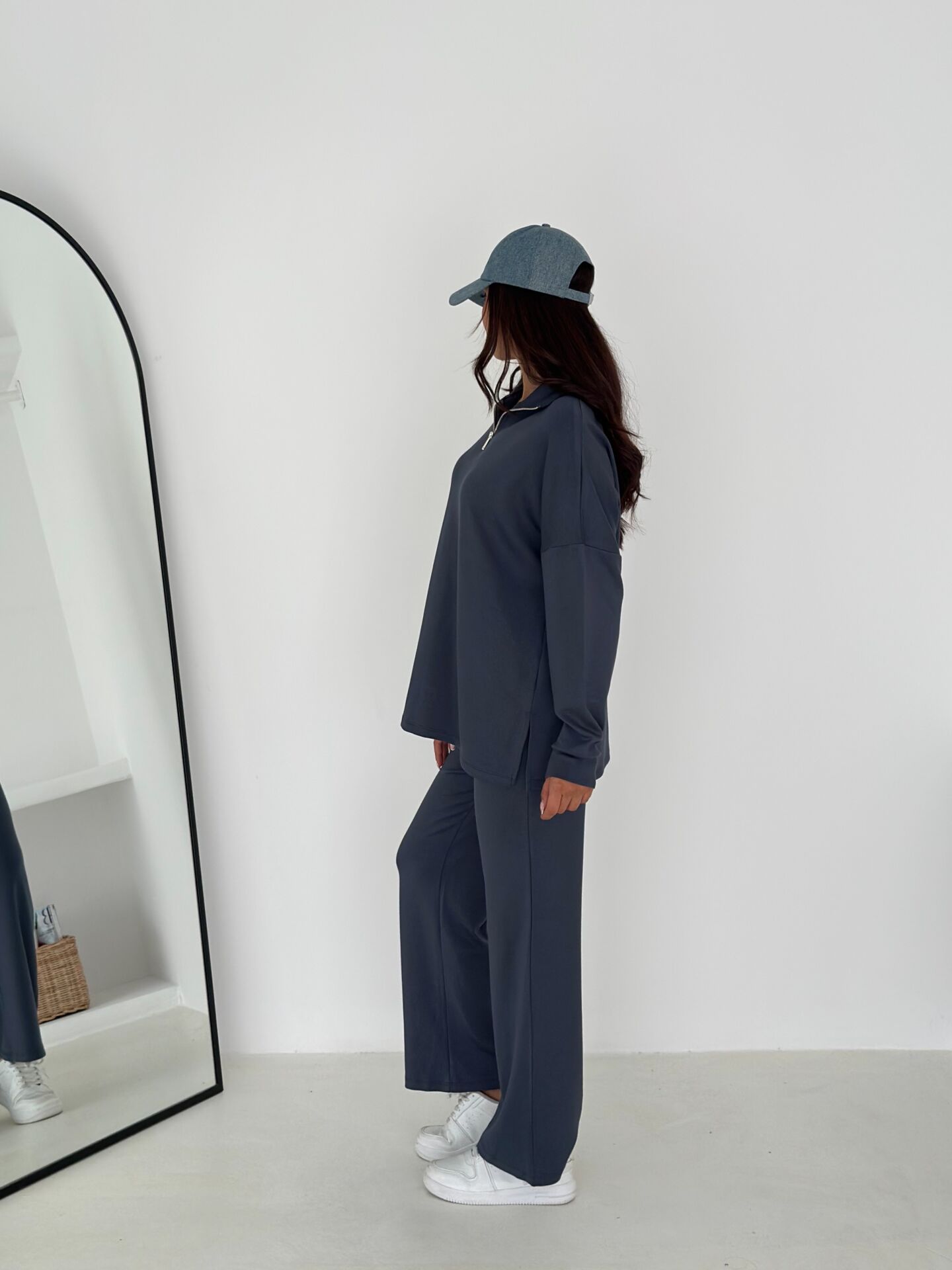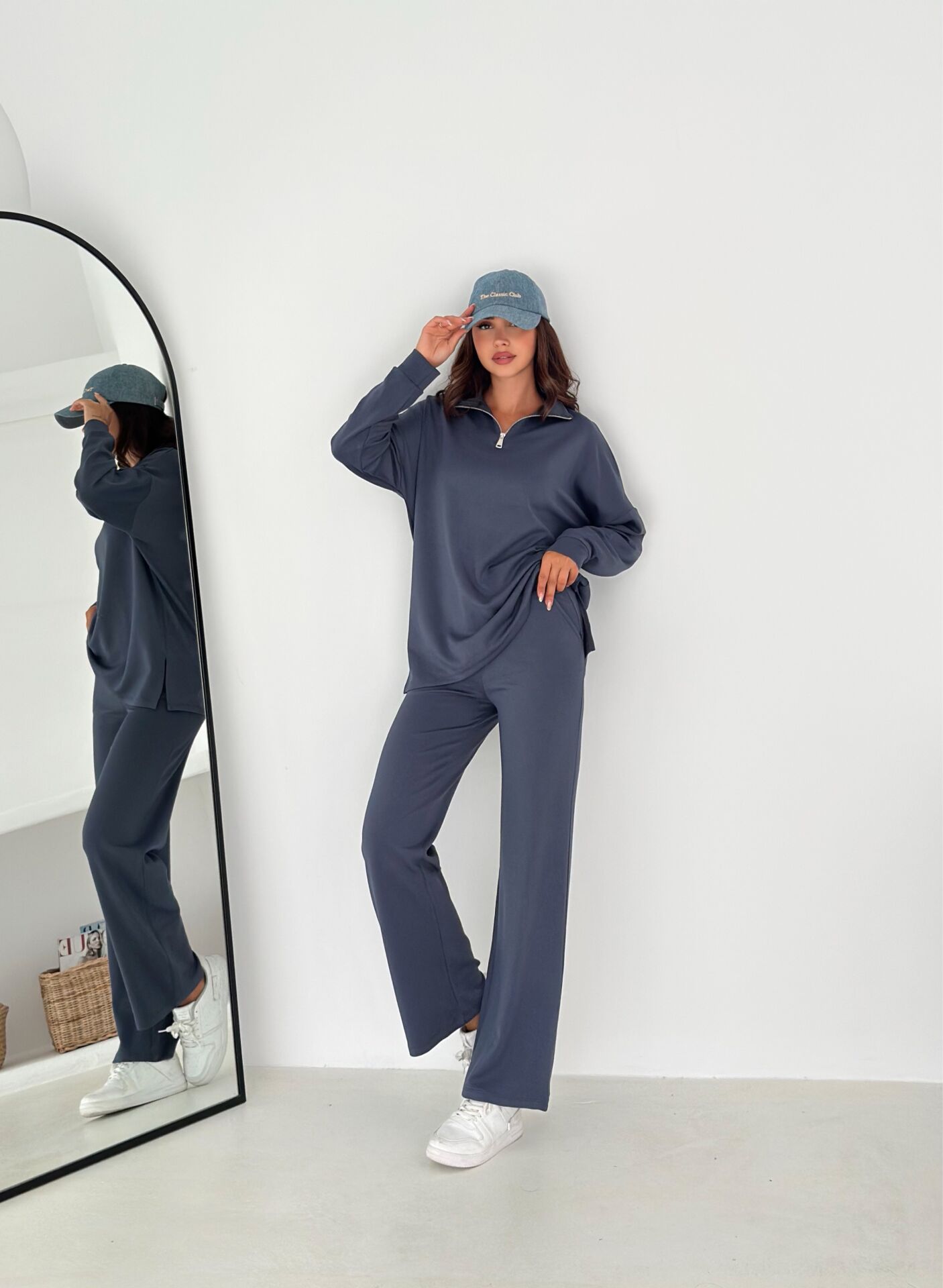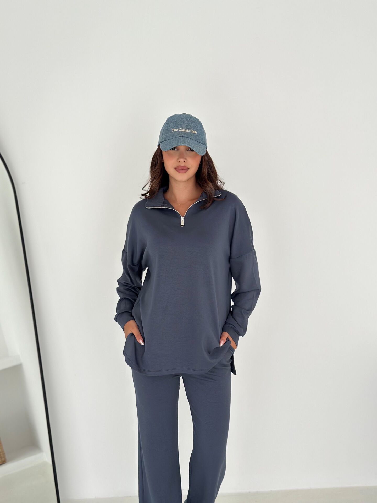 Kadın Femuarlı Dik Yaka Pantolon Cepli Uzun Kollu Alt Üst Takım 2558 XL - KOYU GRİ FÜME