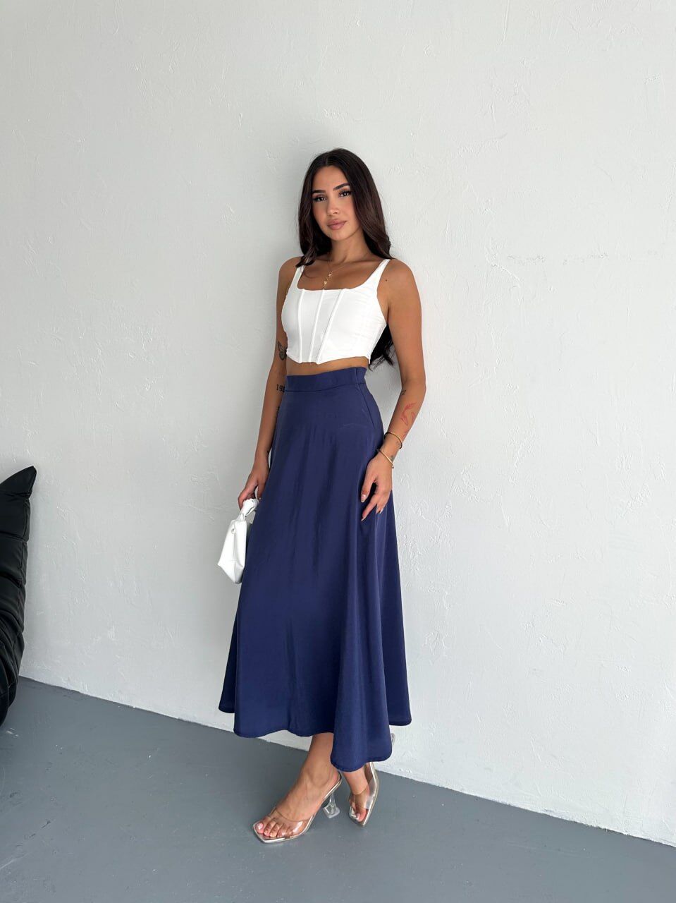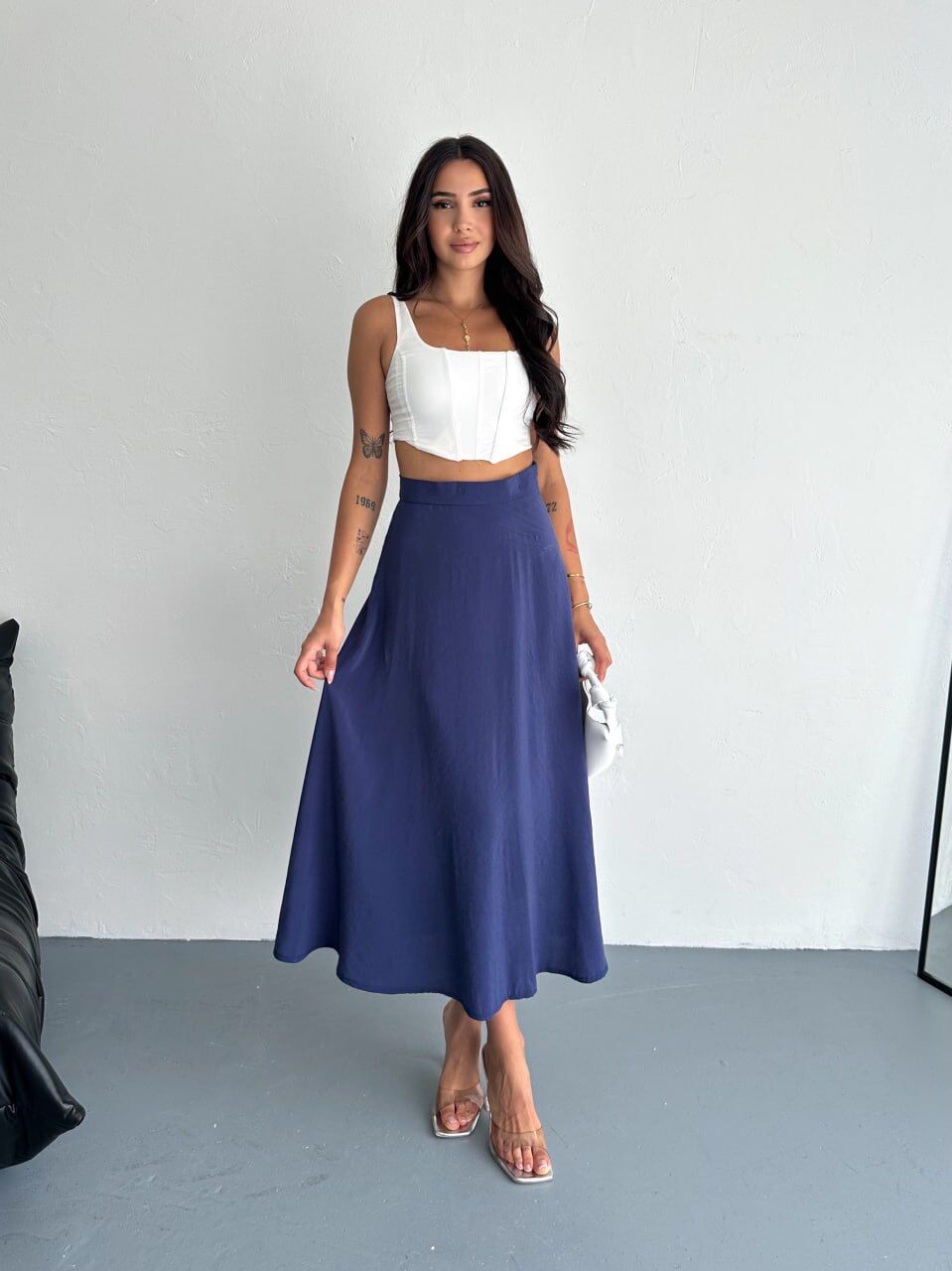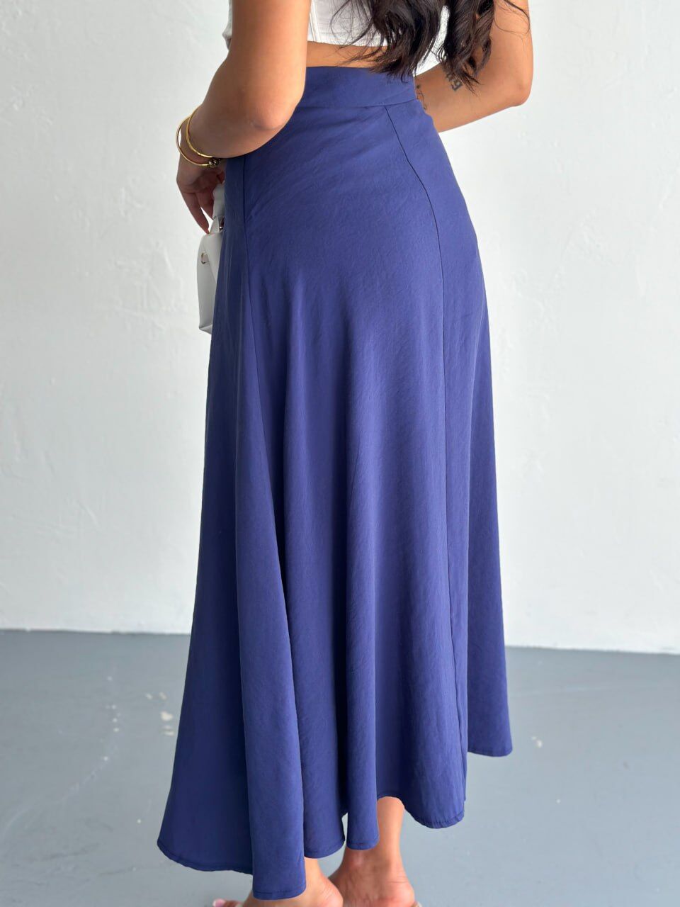 Tesettür giyim koleksiyonuna özel olarak tasarlanan bu uzun kloş etek, yüksek bel kesimi sayesinde vücut hatlarını nazikçe sarar ve zarif bir siluet ortaya çıkarır. Düz deseni ve zamansız lacivert tonu, modası geçmeyen bir şıklık sunarken, gün içinde hem gündüz hem gece ortamlarında rahatlıkla tercih edilebilecek çok yönlü bir parça olmasını sağlar. TR menşeli üretim tesislerinde, yerel işçilikle üretilmiş olması ise kalite ve dayanıklılık beklentisini karşılar.