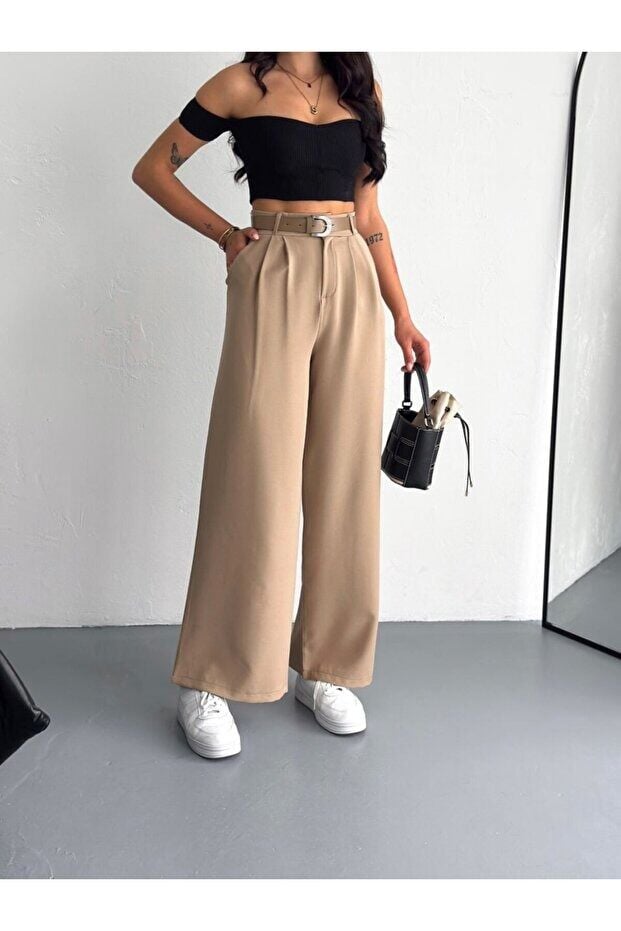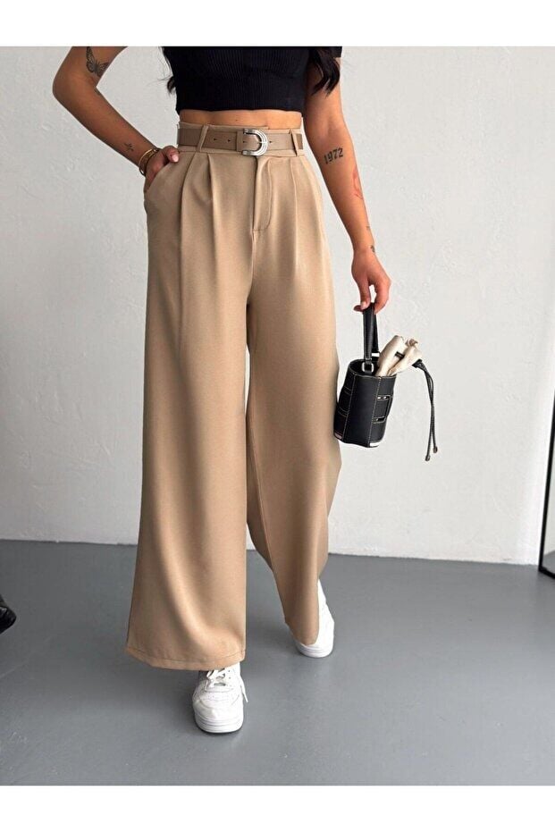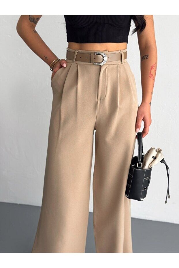 Kadın Double Kemerli ve Ön Pileli Kumaş Pantolon 2459 M - BEJ