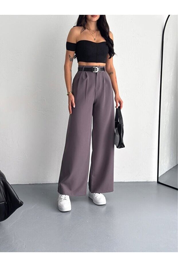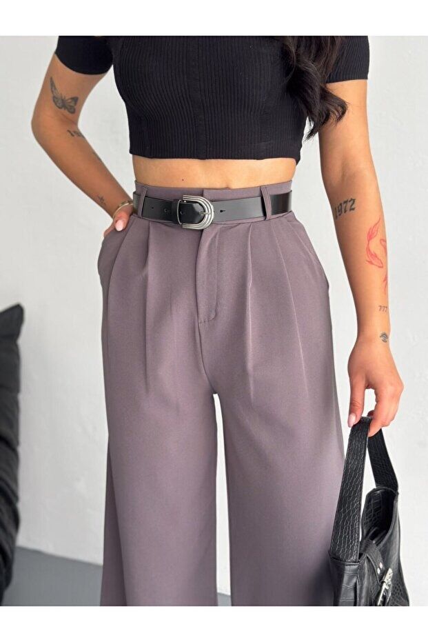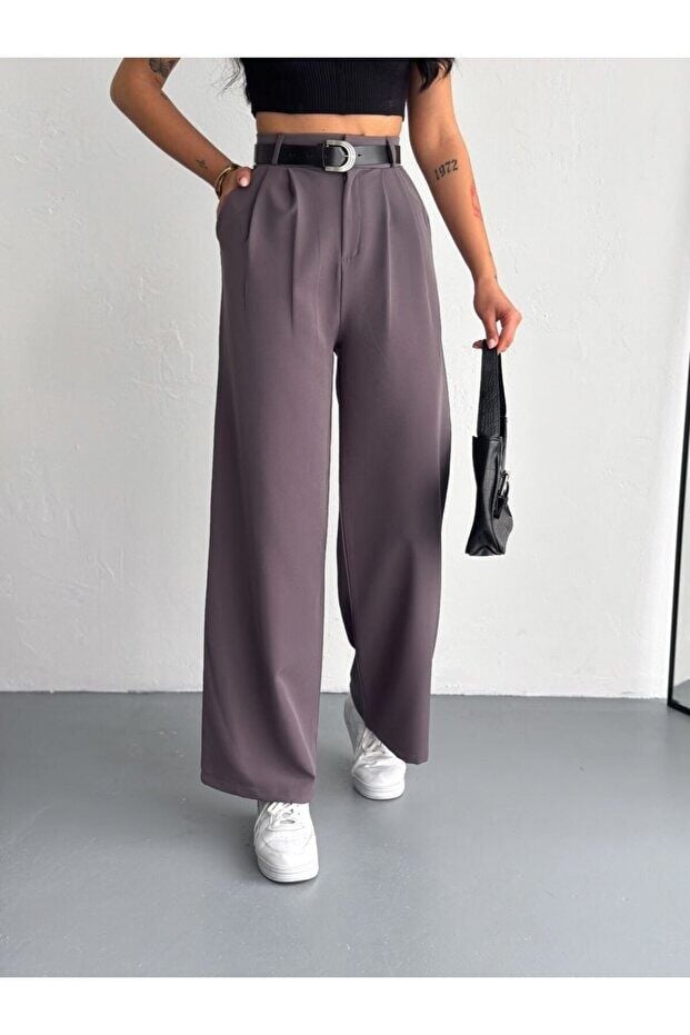 Kadın Double Kemerli ve Ön Pileli Kumaş Pantolon 2459 M - FÜME GRİ
