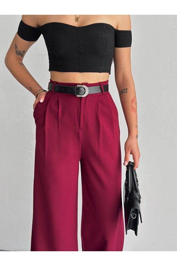 Kadın Double Kemerli ve Ön Pileli Kumaş Pantolon 2459 XL - BORDO
