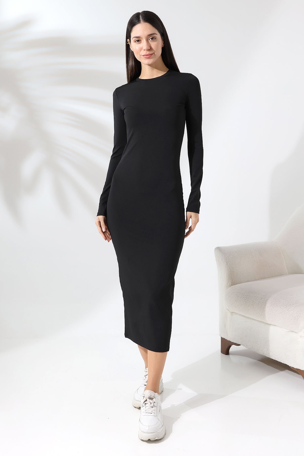 Örme kumaş yapısı esnek kullanım sağlarken, iç göstermeyen özelliği sayesinde gün boyu güvenli bir konfor sunar. Bisiklet yaka ve uzun kol tasarımı elbiseyi dört mevsim kullanıma uygun hale getirir.