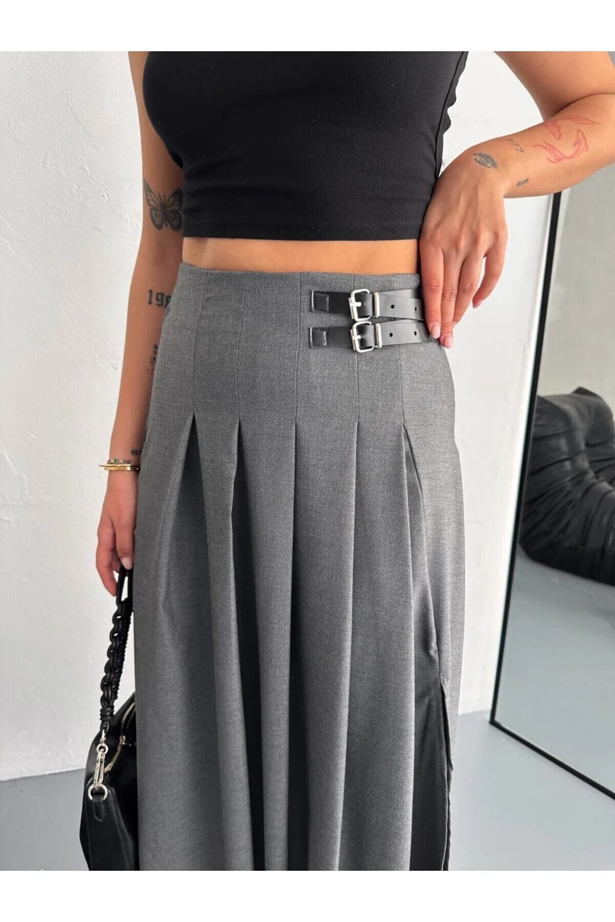 Kadın Tokalı ve Yırtmaçlı Pileli Uzun Maxi Etek 2466 M - KOYU GRİ