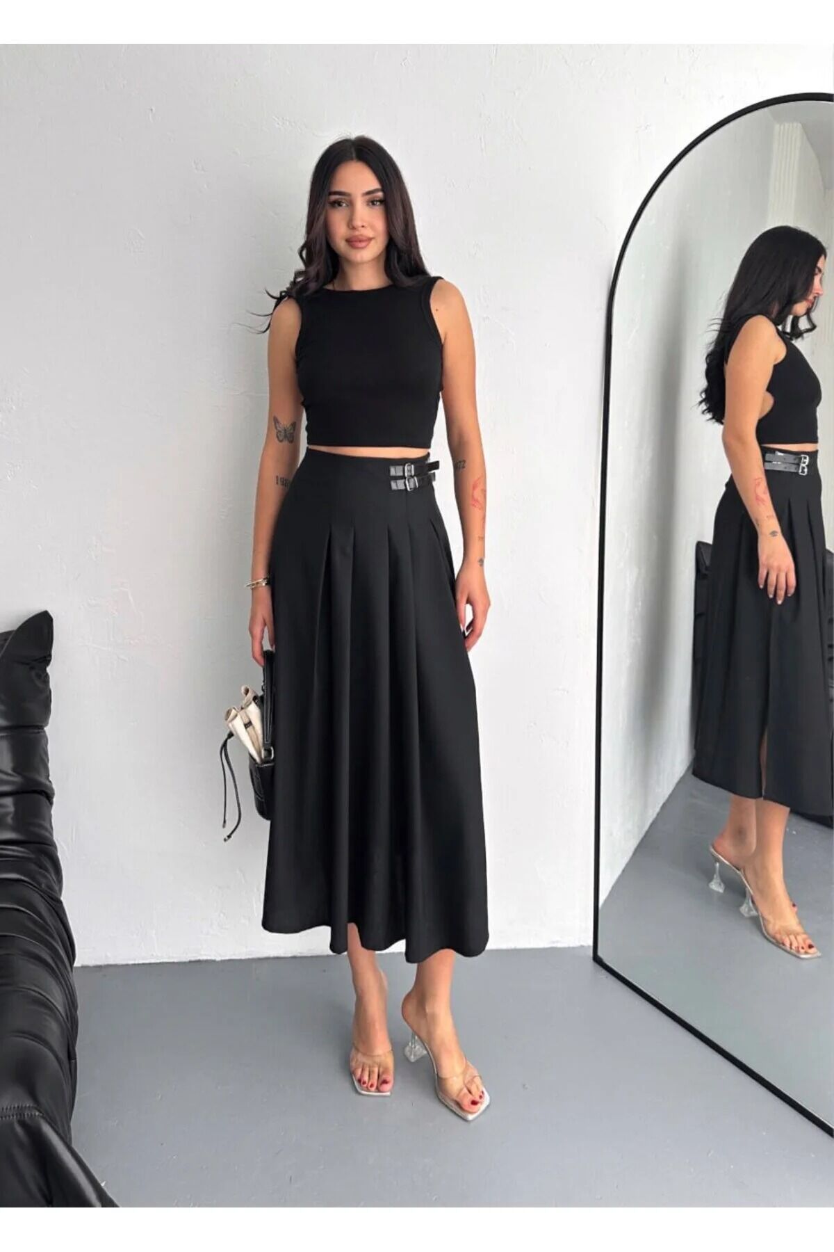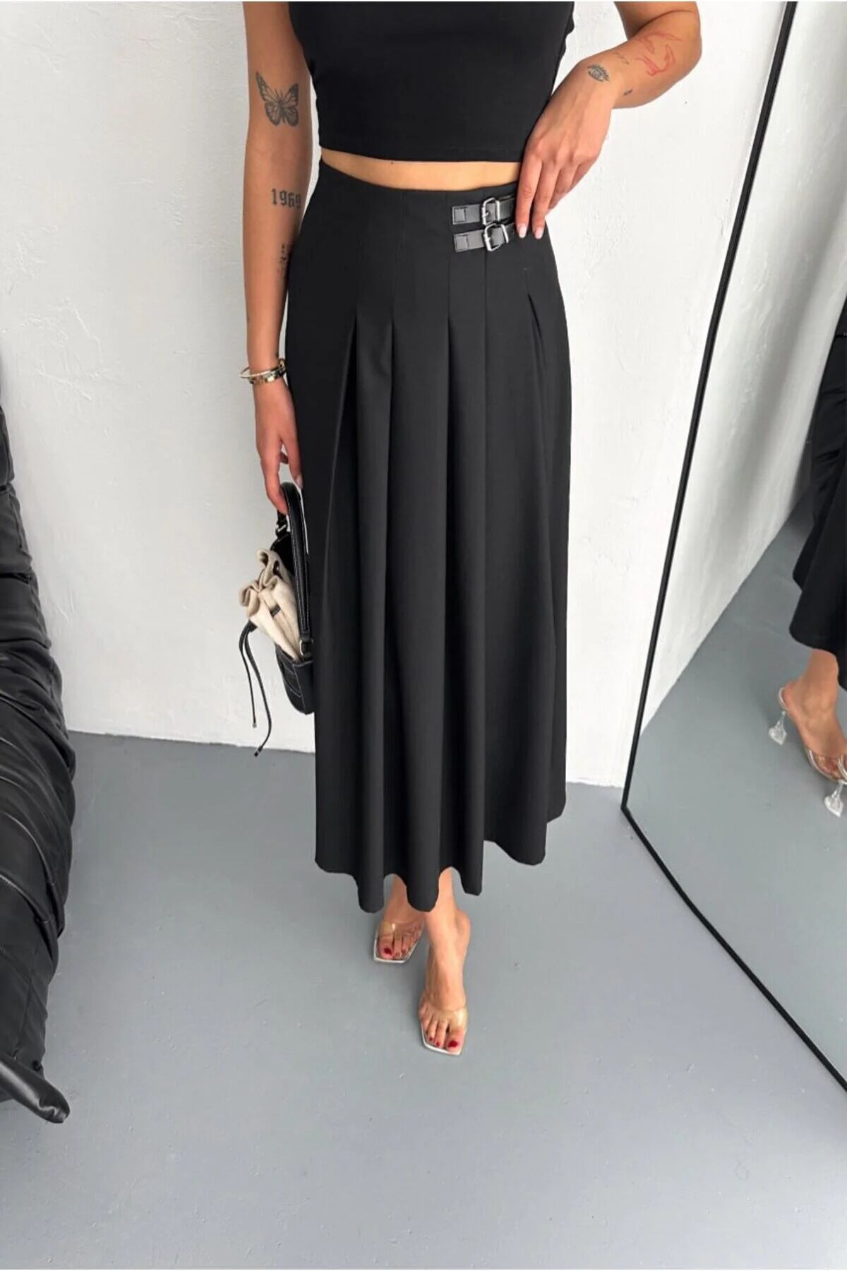 Tokalı detay eteğe karakter katan modern bir görünüm sunarken, yarım pat fermuar kapama şekli fonksiyonelliği artırır. Kemersiz yapısı hareket özgürlüğü sağlar ve belde rahatsızlık hissi yaratmaz. Trend ortamlarda şık bir duruş oluşturmak isteyenler için mükemmel bir tercihtir.