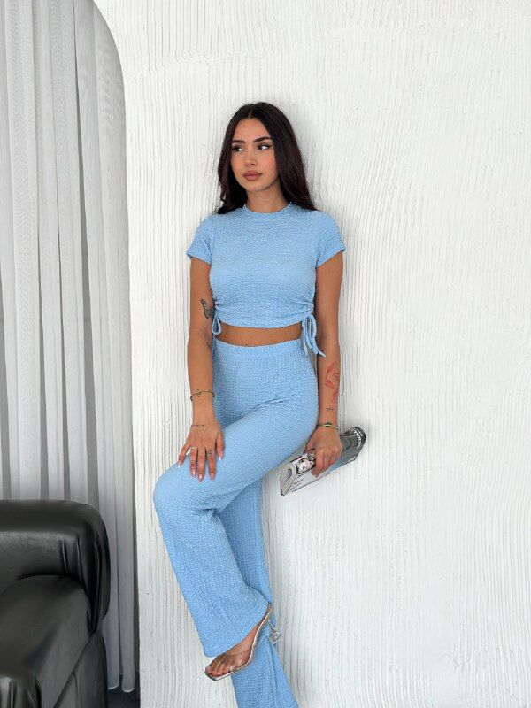 Rahatlık ve şıklığı bir arada sunan gofre kumaş alt-üst kadın takım modeli, likralı yapısı sayesinde gün boyu konfor sağlar. Bisiklet yaka üst parçası modern ve sade bir görünüm oluştururken, yüksek bel geniş paça pantolon vücut hatlarını zarif şekilde sarar.