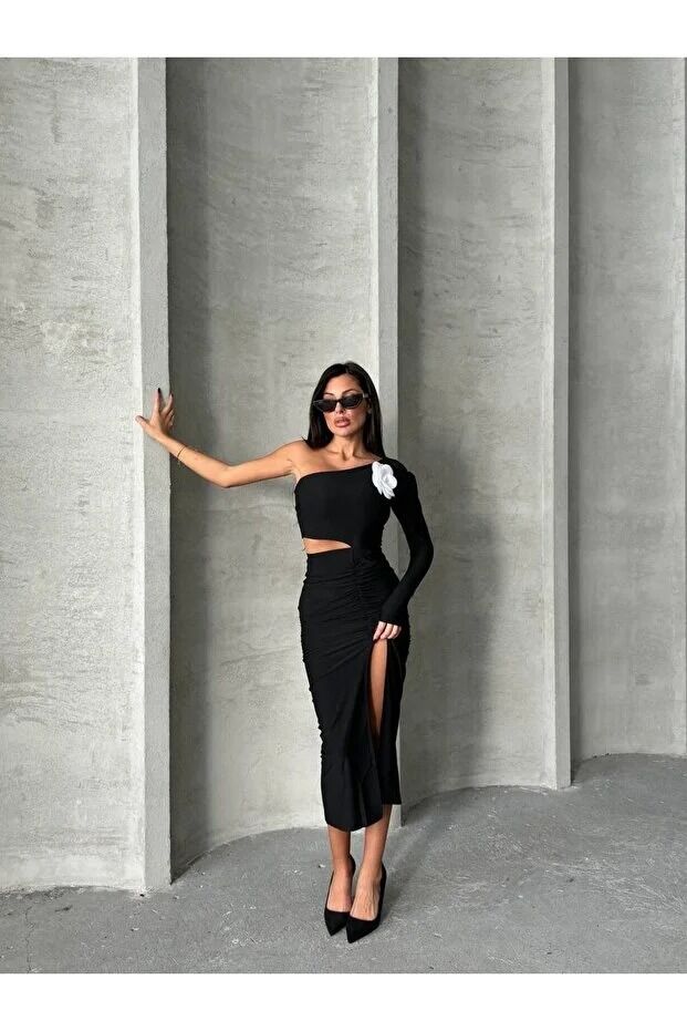 Kadın Tek Omuzlu Önden Yırtmaçlı Gül Detaylı Elbise BIG XL - SİYAH