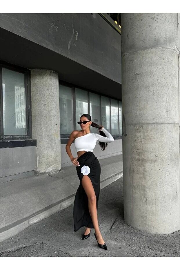 Kadın Tek Omuzlu Önden Yırtmaçlı Gül Detaylı Elbise BIG XL - SİYAH-BEYAZ
