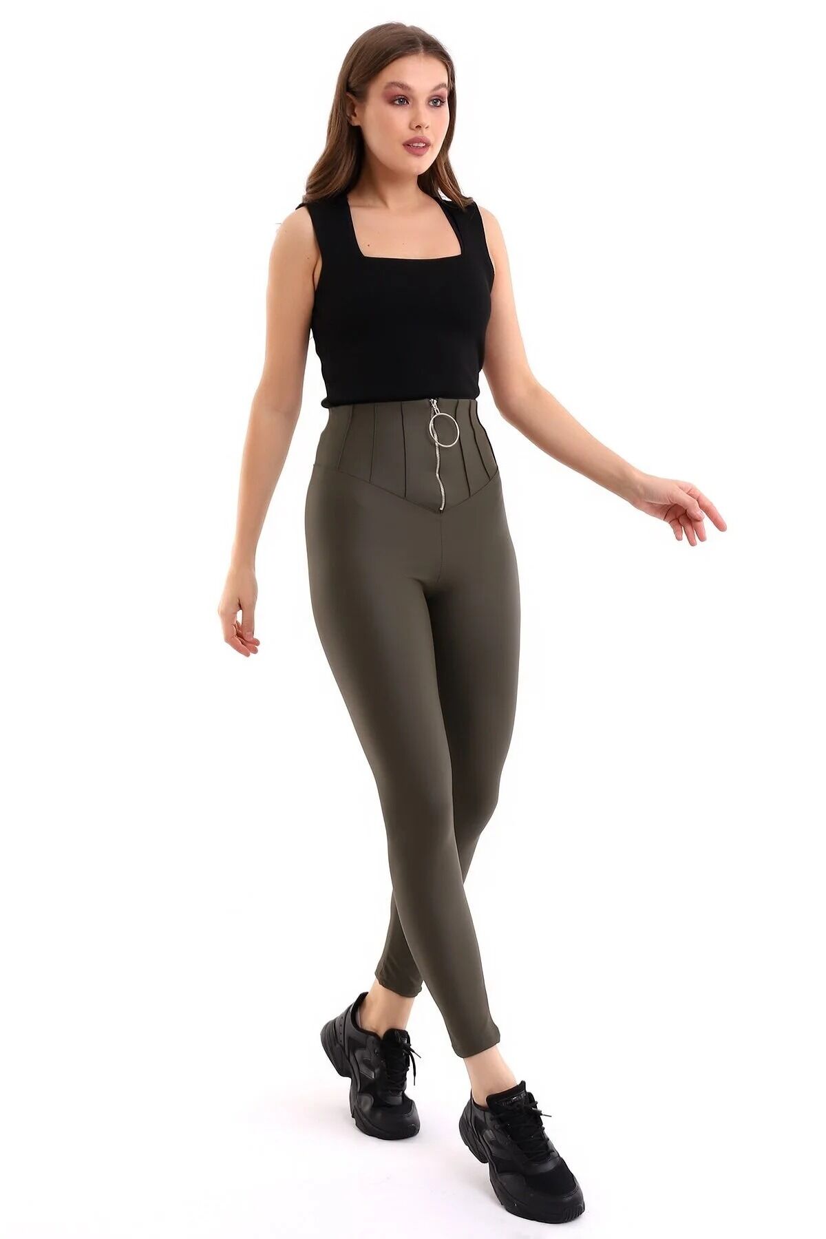Halka Fermuar Detaylı Mat Suni Deri Tayt 2037 L - HAKİ