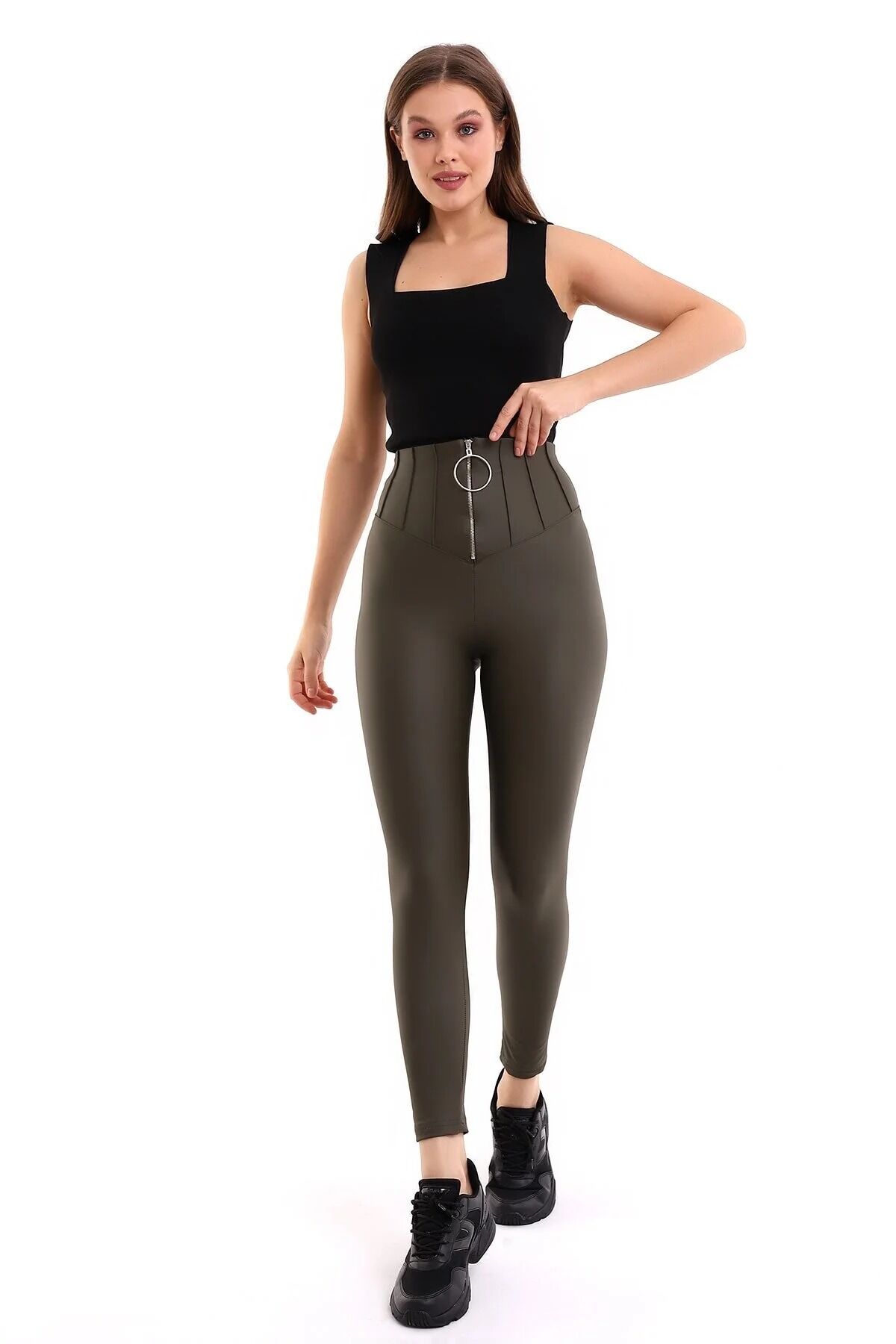 Halka Fermuar Detaylı Mat Suni Deri Tayt 2037 S - HAKİ
