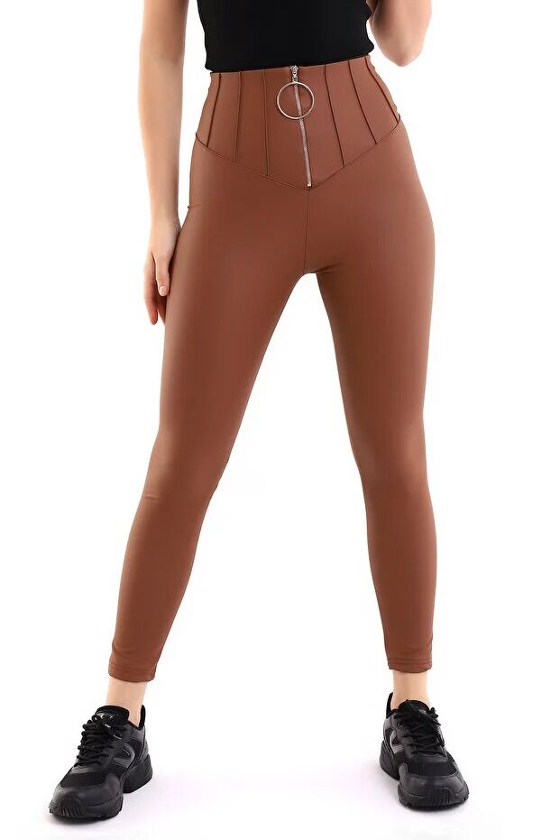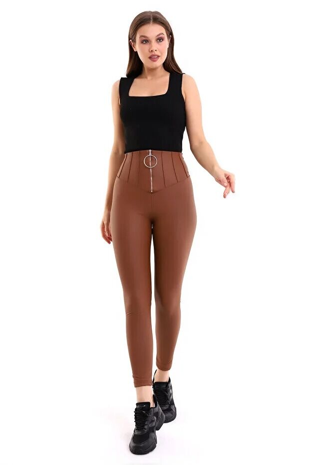 Halka Fermuar Detaylı Mat Suni Deri Tayt 2037 XL - KAHVERENGİ