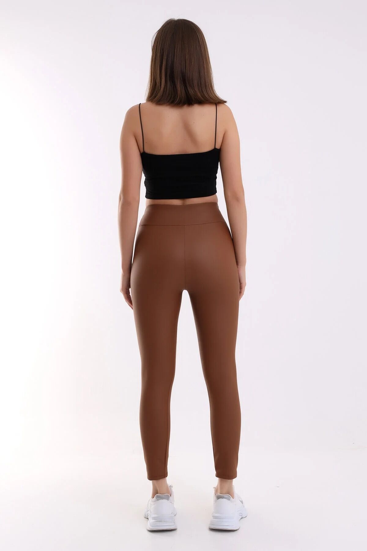 İçi Şardonlu Yüksek Bel Mat Suni Deri Tayt 1545 M - KAHVERENGİ