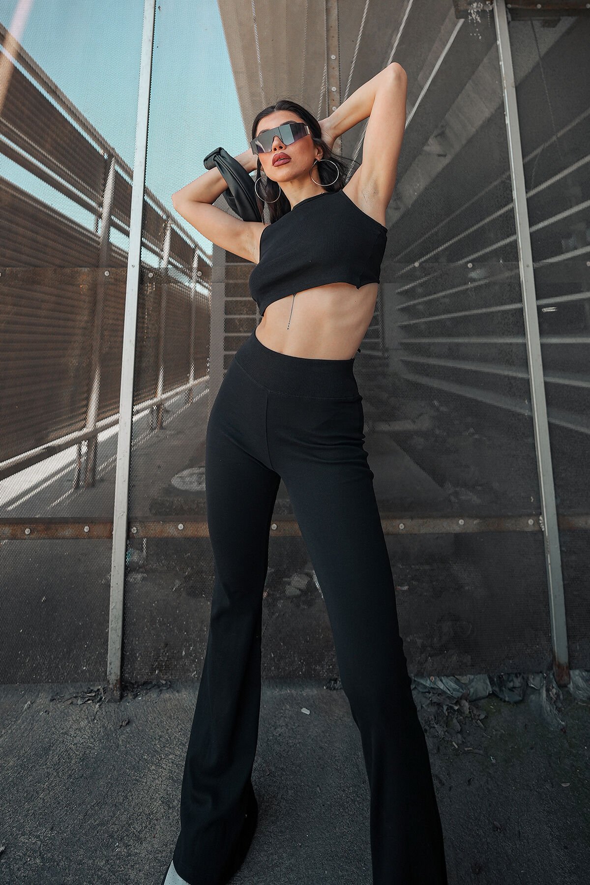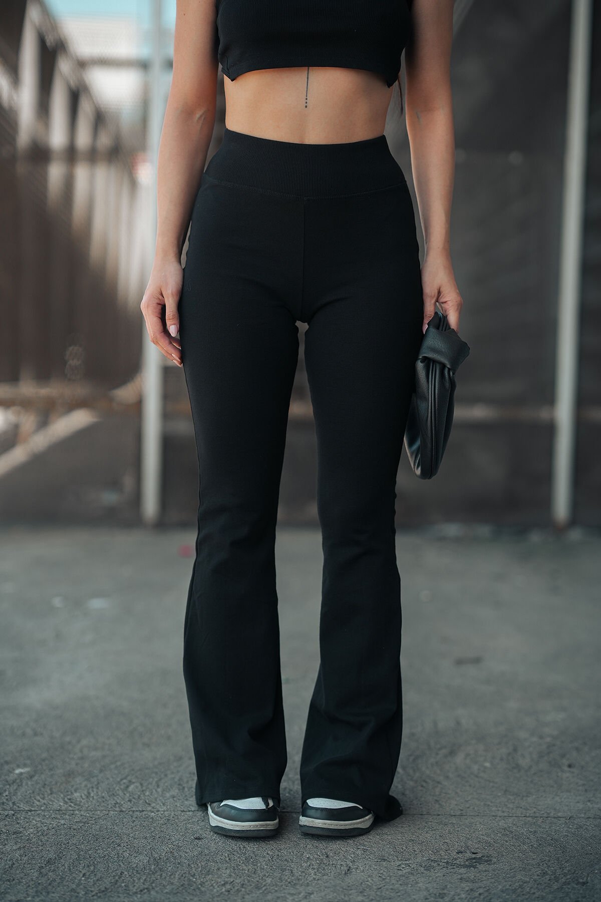 İspanyol paça tayt eşofman / tayt pantolon modeli, geniş kemer tasarımı ve yüksek bel formu ile belinizi zarifçe sararak feminen bir görünüm oluşturur. İnterlok dokuma yapısı, ürünün dayanıklılığını artırırken hareket özgürlüğü sunar.