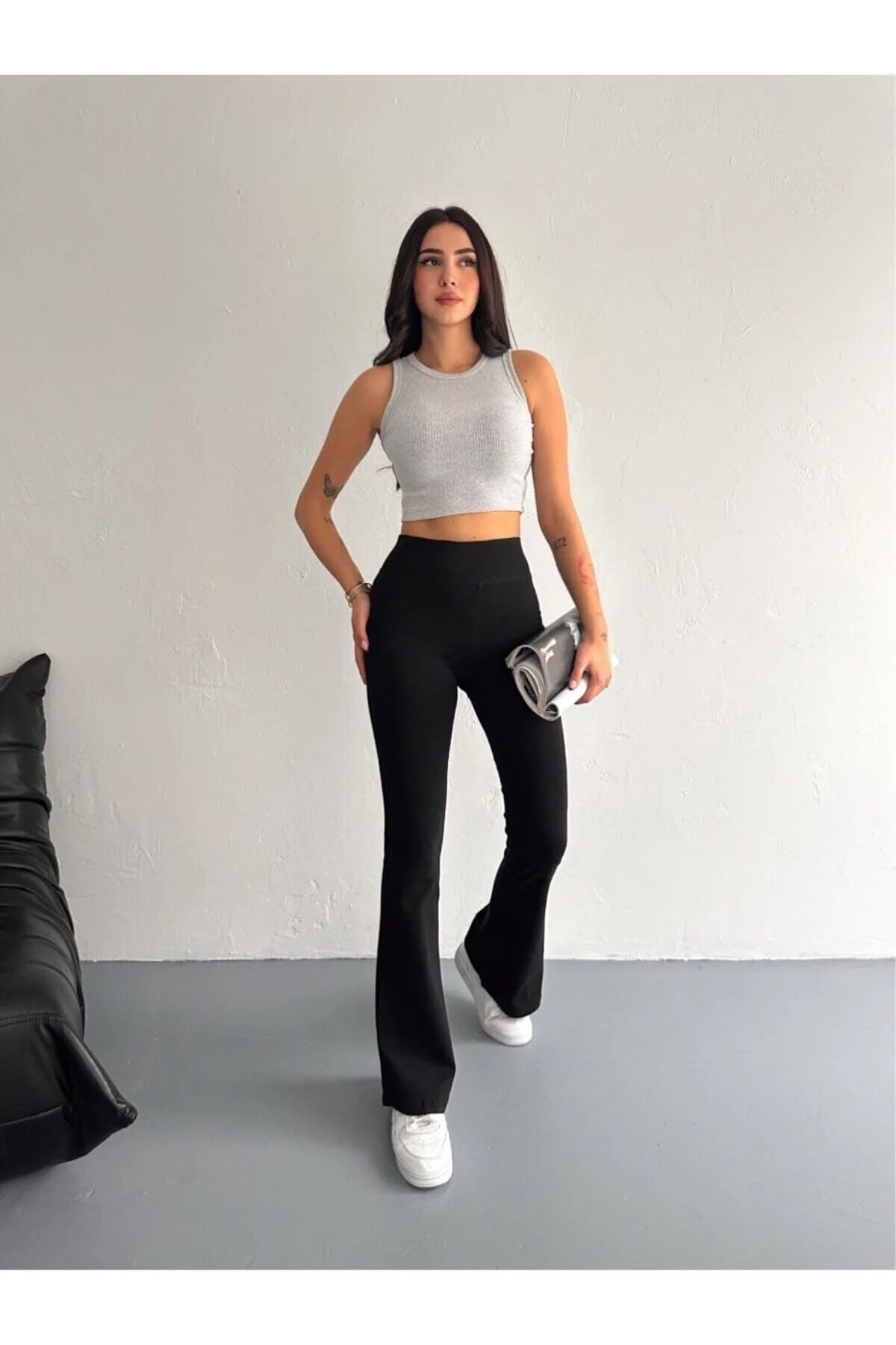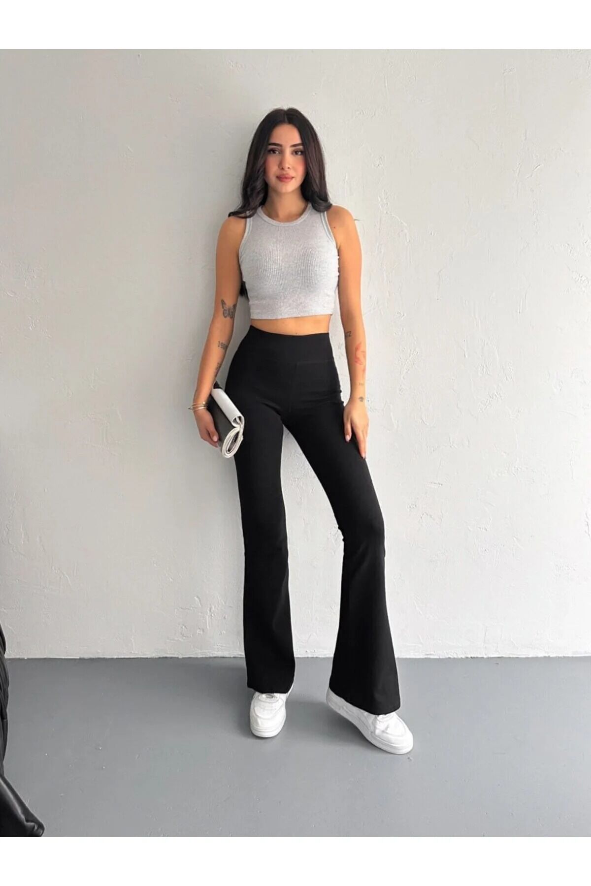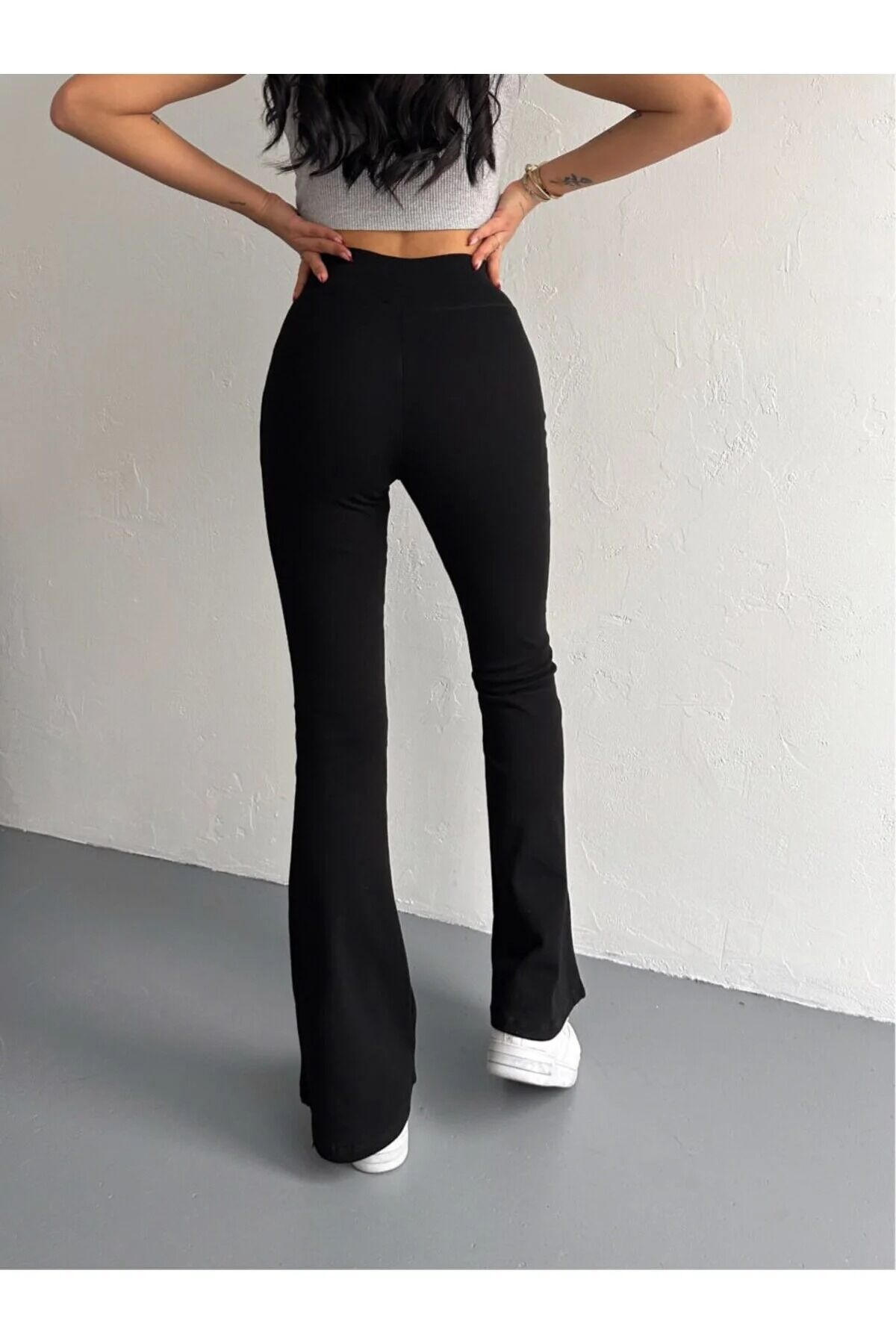 İspanyol paça tayt eşofman / tayt pantolon modeli, geniş kemer tasarımı ve yüksek bel formu ile belinizi zarifçe sararak feminen bir görünüm oluşturur. İnterlok dokuma yapısı, ürünün dayanıklılığını artırırken hareket özgürlüğü sunar.