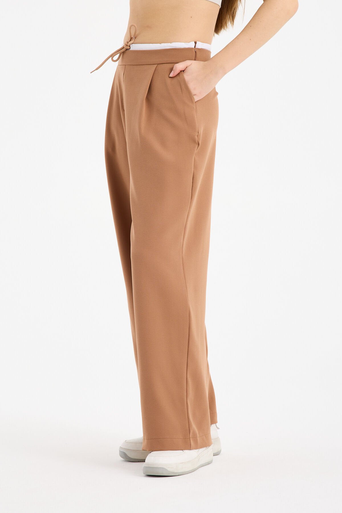 Kadın Çift Bel Bantlı Wide Leg Pantolon 1517 2XL - BEJ