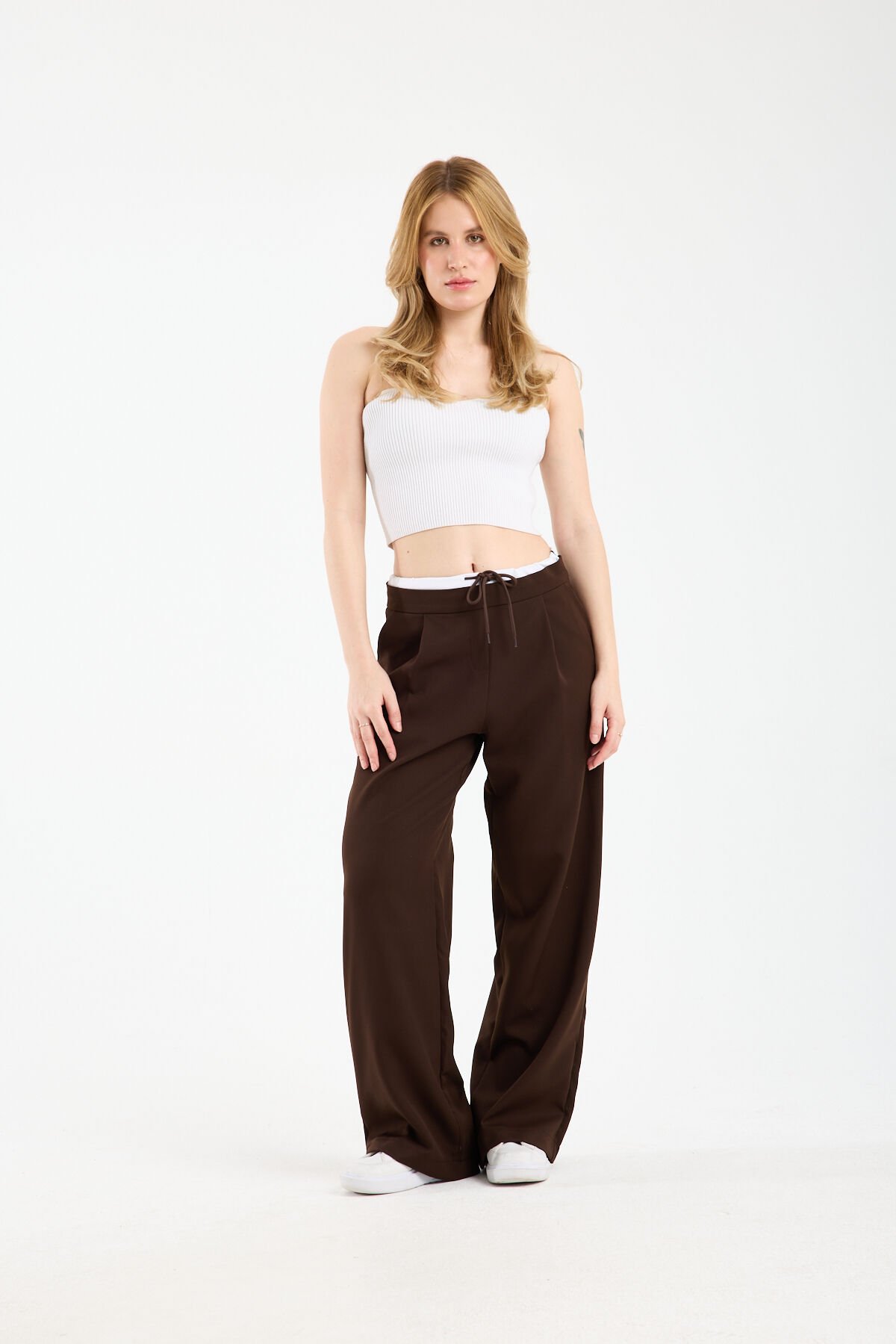 Kadın Çift Bel Bantlı Wide Leg Pantolon 1517 M - KAHVERENGİ