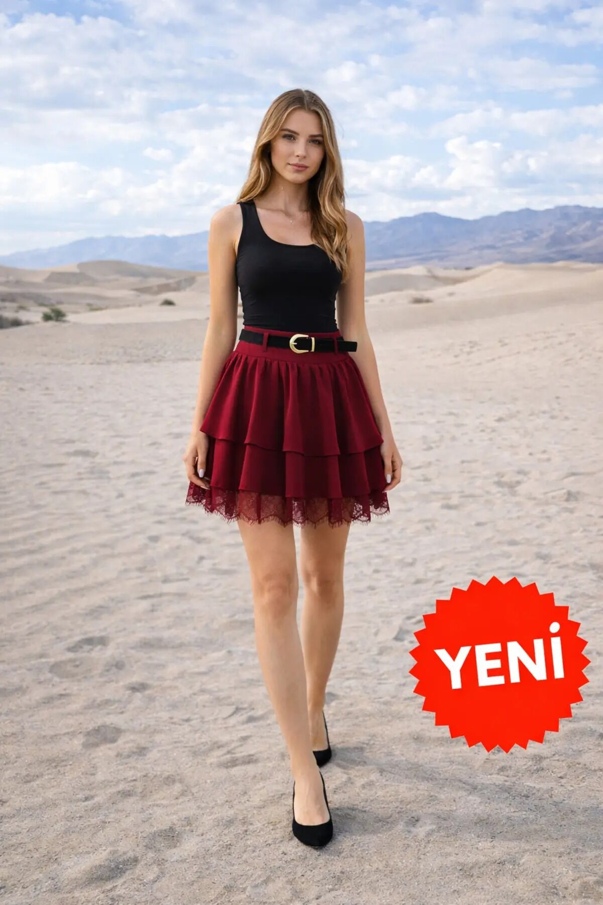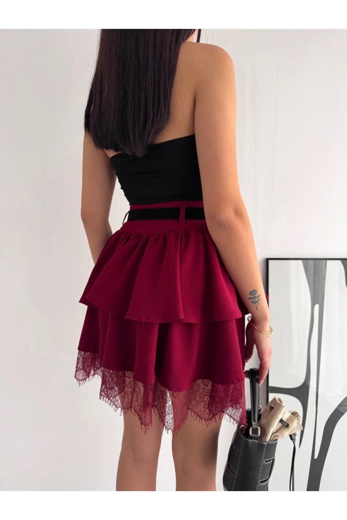 Kadın Dantel Güpürlü Kat Kat Mini Etek – Kemerli İthal Krep Kumaş Fermuarlı Şık Günlük Etek-2645 XL - BORDO
