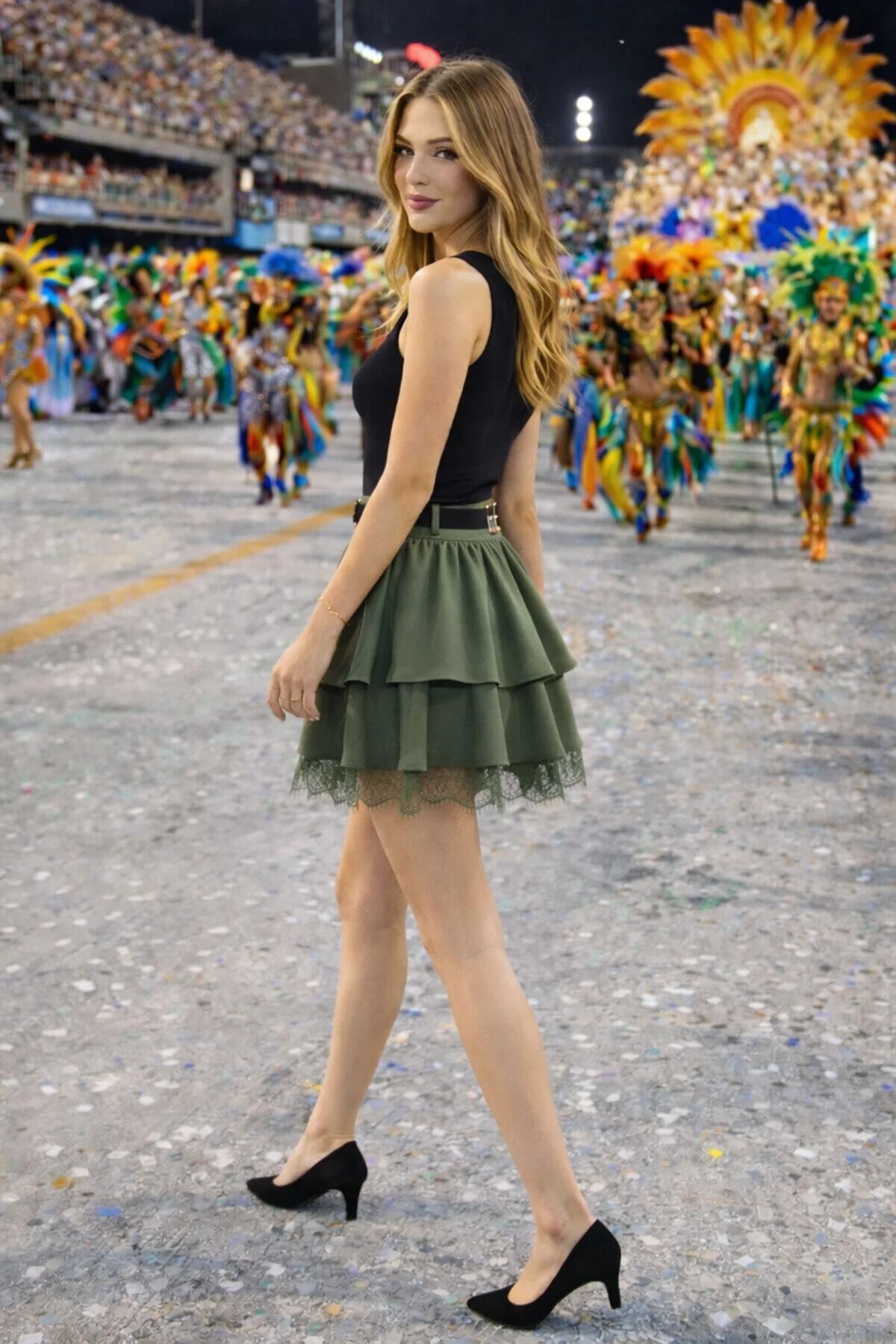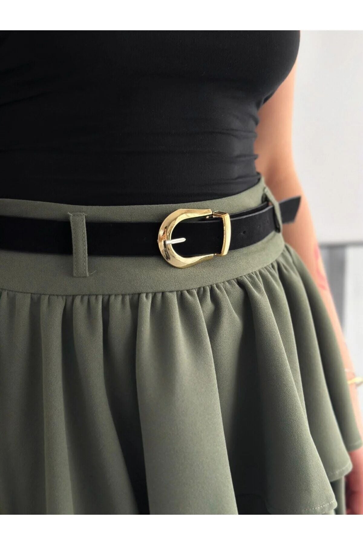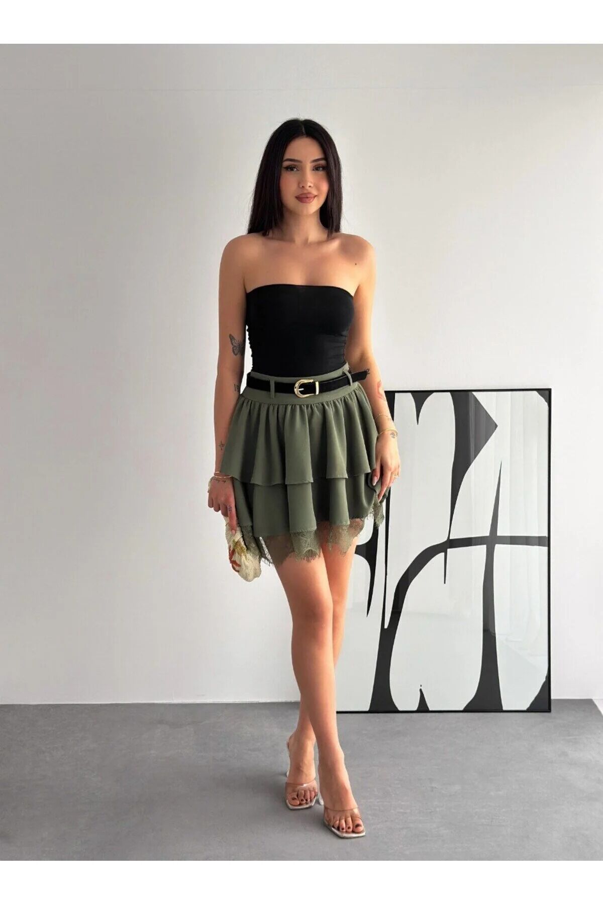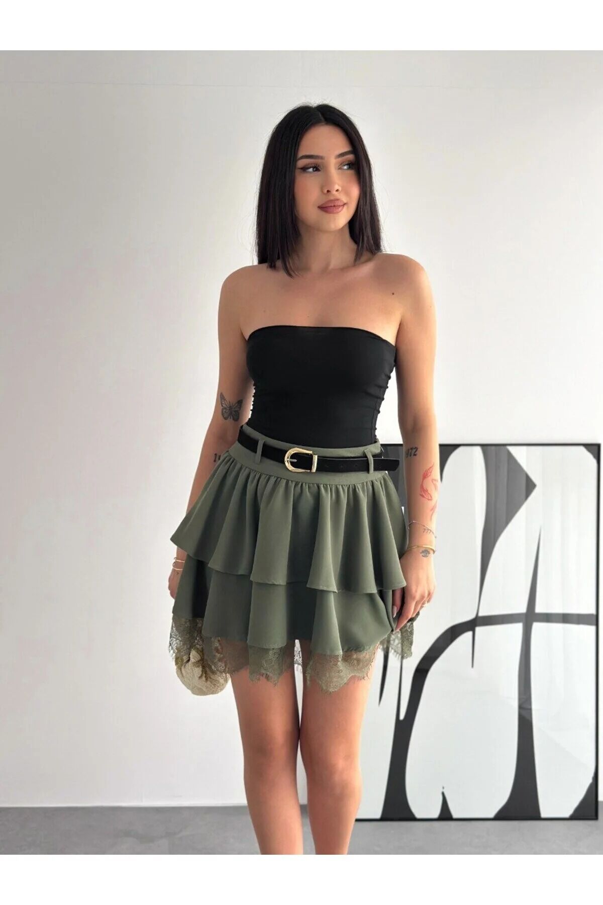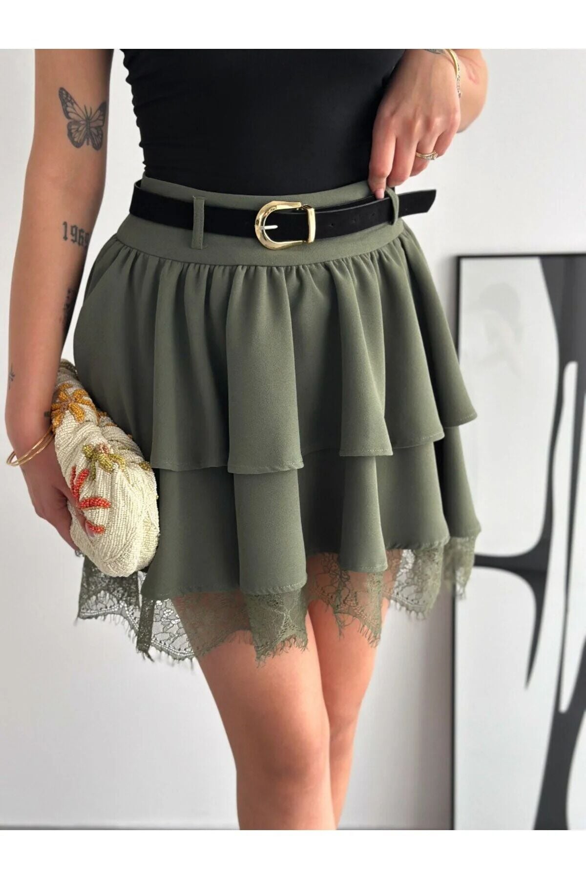 Kadın Dantel Güpürlü Kat Kat Mini Etek – Kemerli İthal Krep Kumaş Fermuarlı Şık Günlük Etek-2645 XL - HAKİ