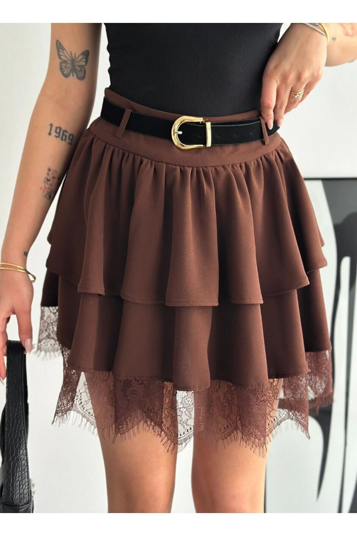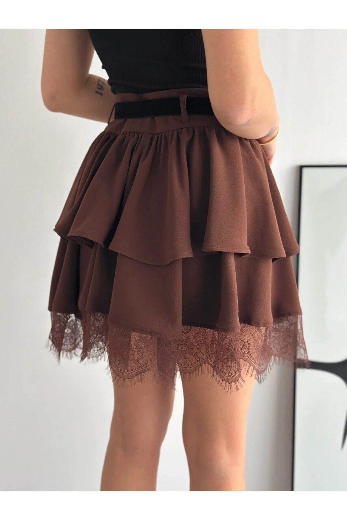 Kadın Dantel Güpürlü Kat Kat Mini Etek – Kemerli İthal Krep Kumaş Fermuarlı Şık Günlük Etek-2645 XL - KAHVERENGİ