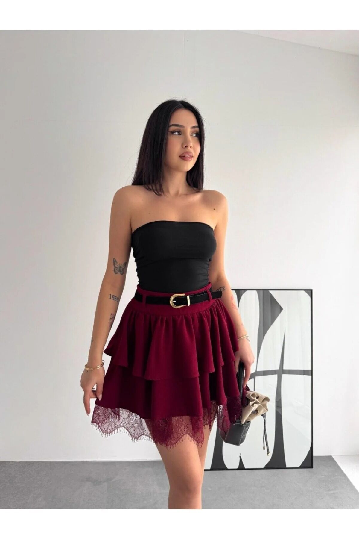 Ürünün tasarımında öne çıkan kemerli mini etek detayı, beli vurgulayarak feminen bir duruş sergilerken, çan kalıbı sayesinde hareket özgürlüğü sunar. İthal krep kumaşın dökümlü yapısı, kat kat dantel güpür detaylarıyla birleşerek her adımda zarif bir akış yaratır.