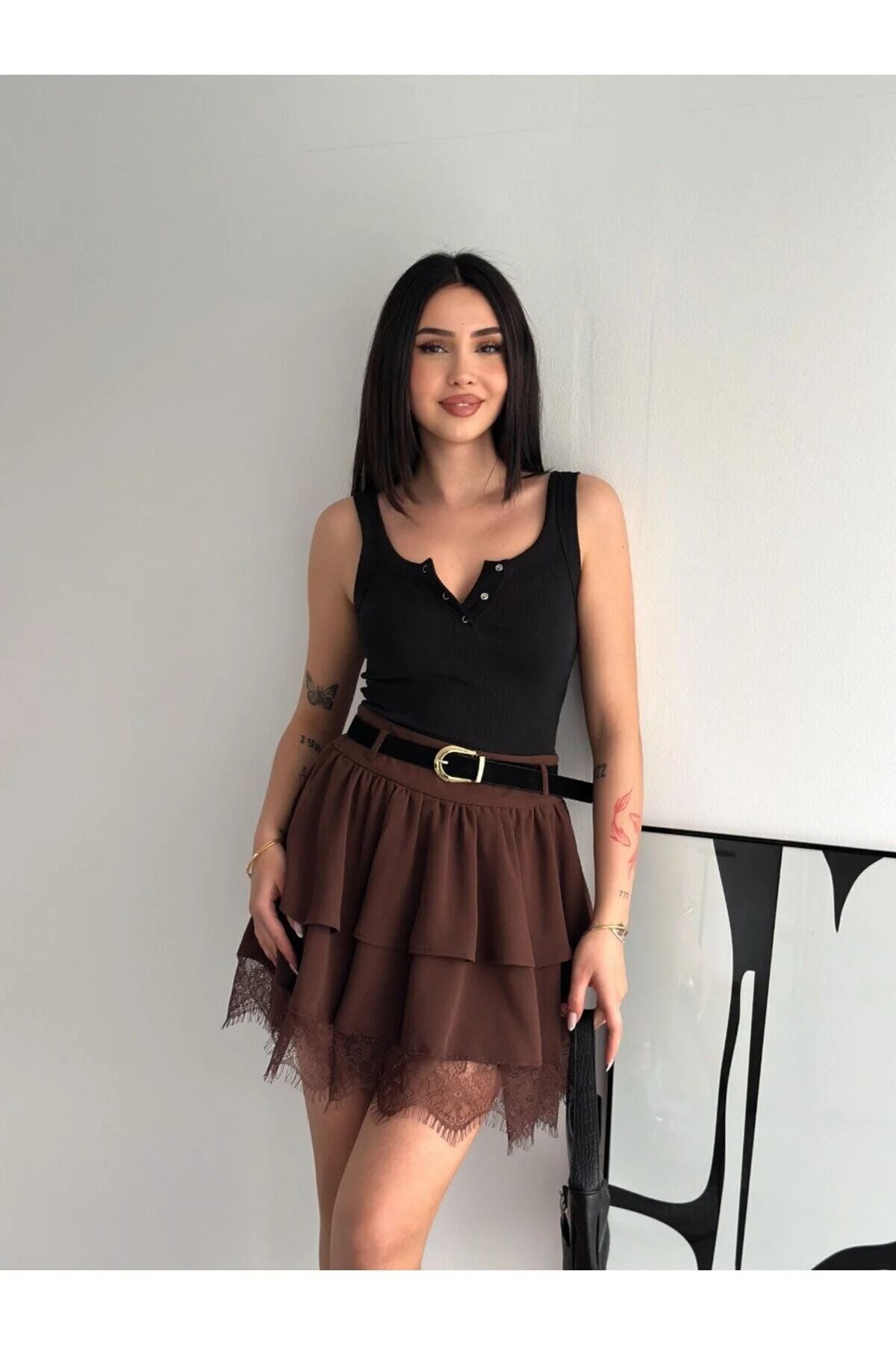Kadın Dantel Güpürlü Kat Kat Mini Etek, ithal krep kumaşın asaletini modern kat kat tasarımıyla birleştirerek gardırobunuza dinamik bir şıklık katıyor. Kahverenginin sıcak tonu ve yüksek bel kesimiyle hem ofis şıklığında hem de günlük kombinlerde kusursuz bir siluet oluşturur.