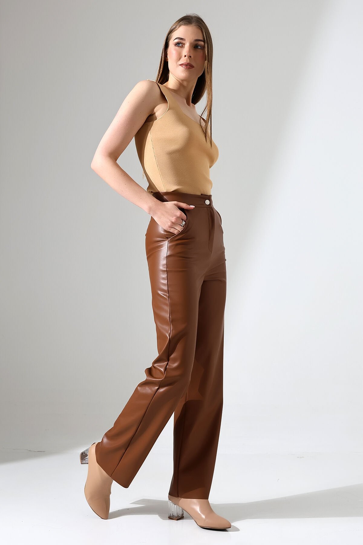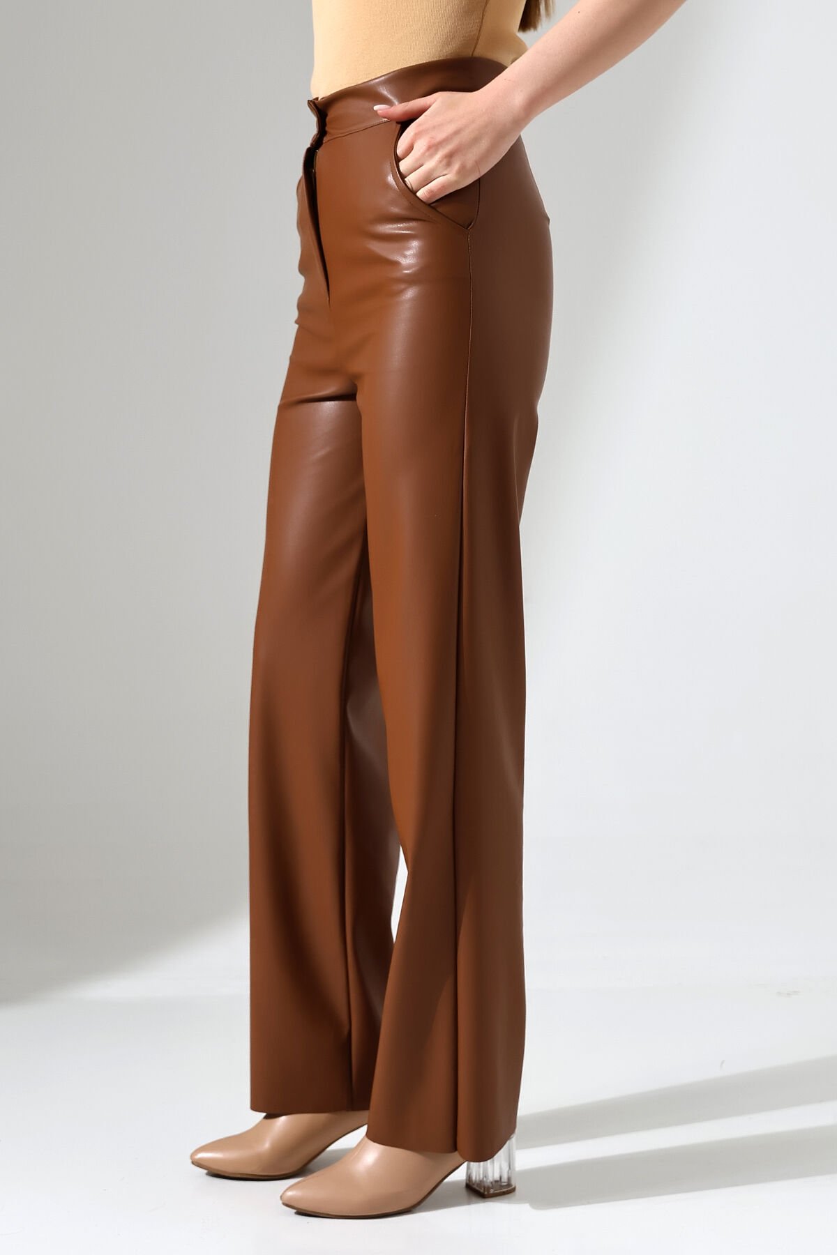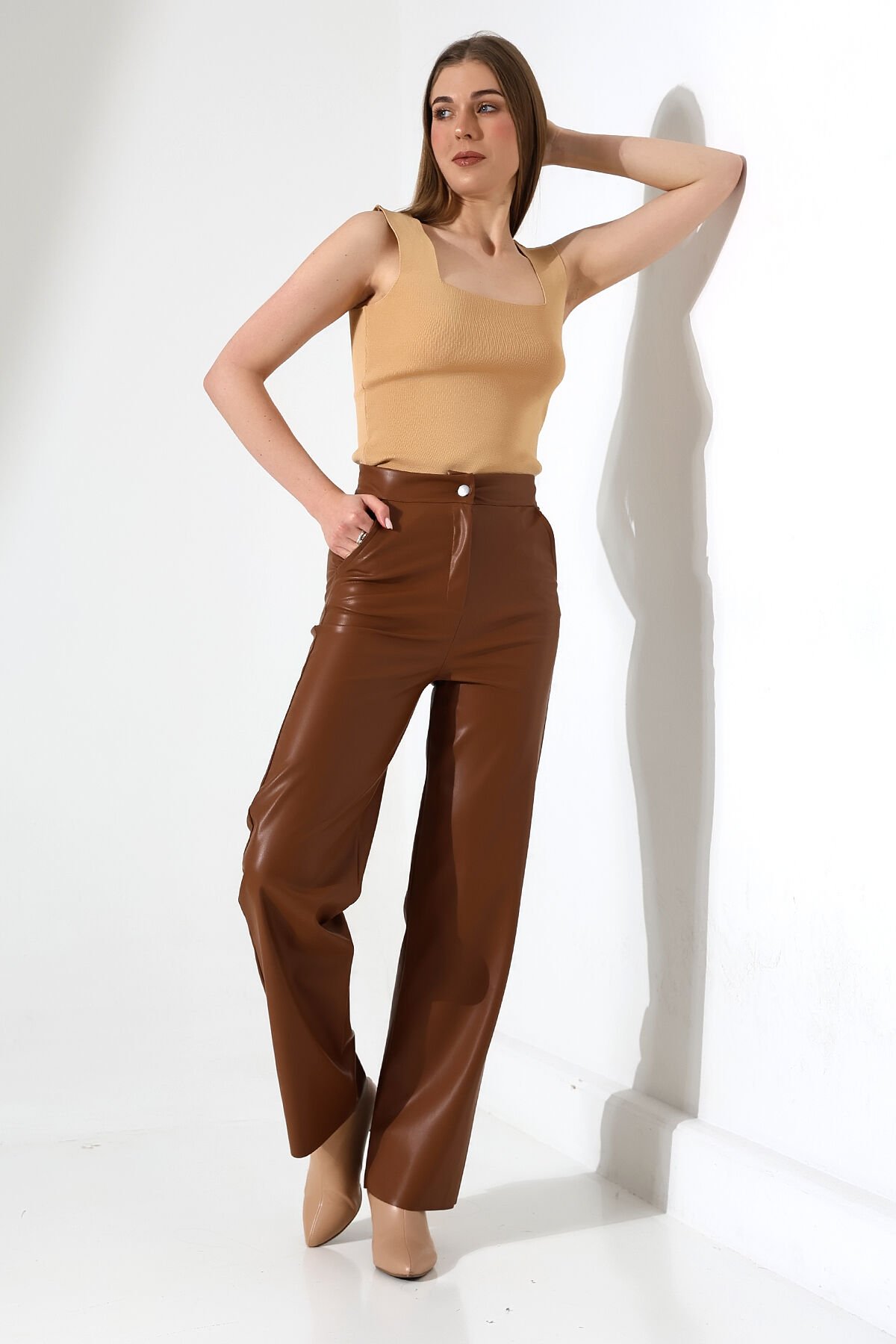 Kadın Deri Bol Paçalı Cepli Pantolon 2427 L - AÇIK KAHVE