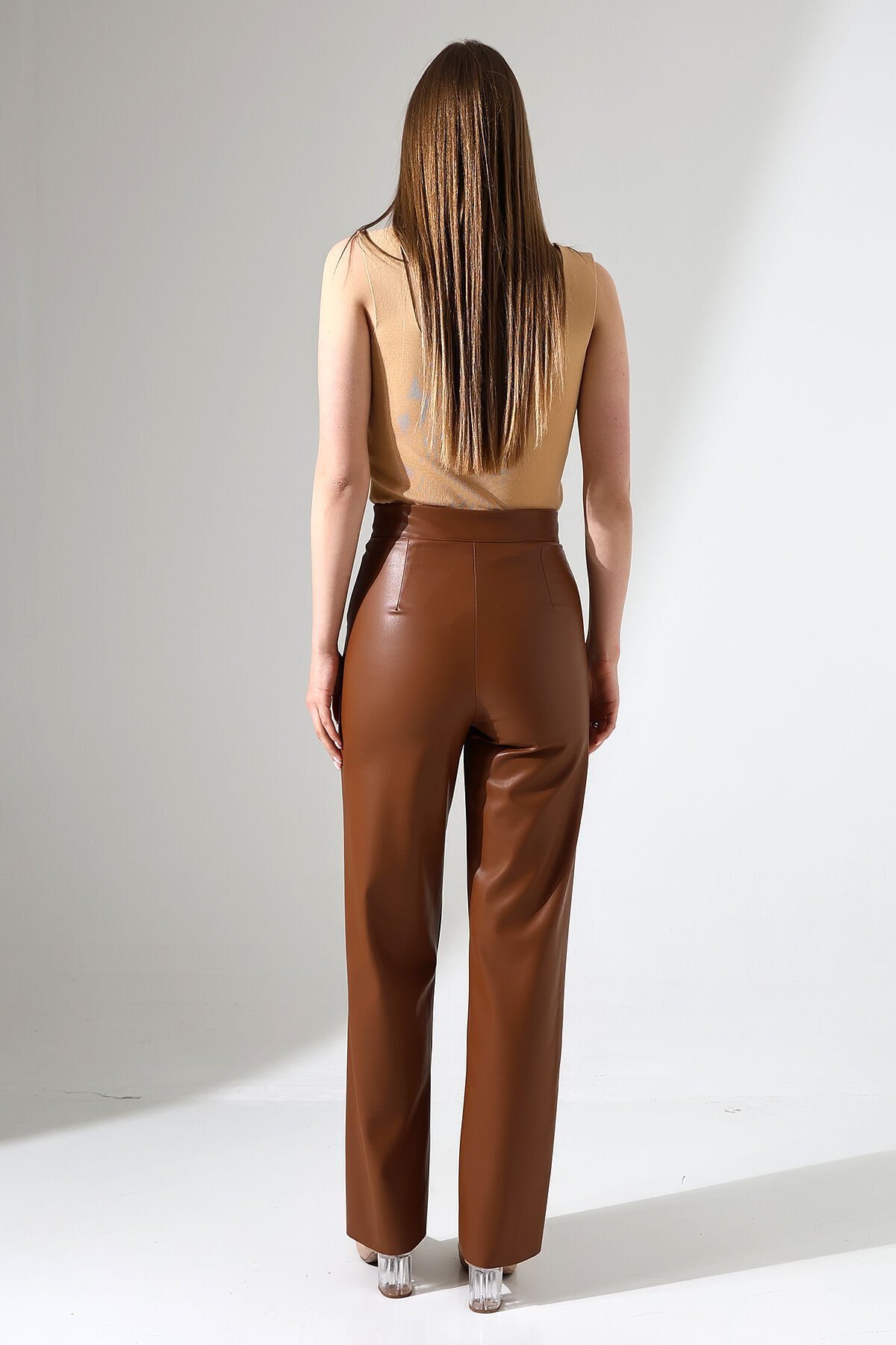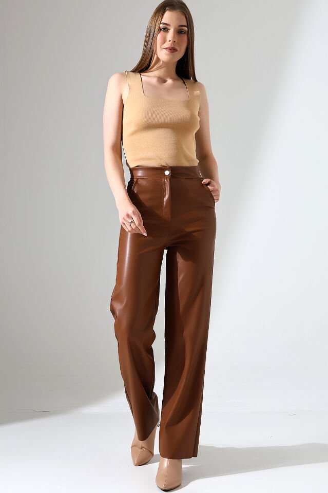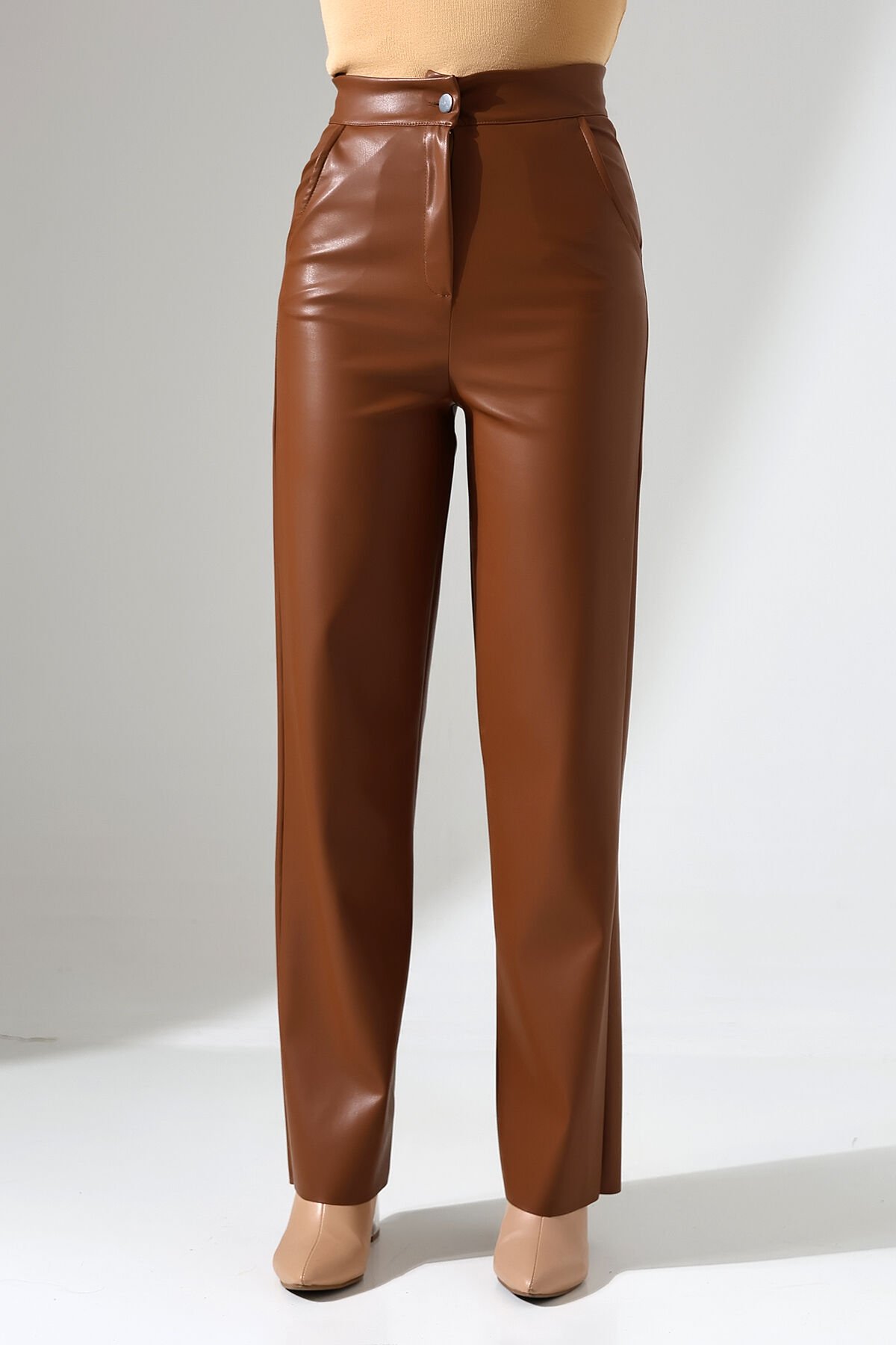 Kadın Deri Bol Paçalı Cepli Pantolon 2427 L - AÇIK KAHVE