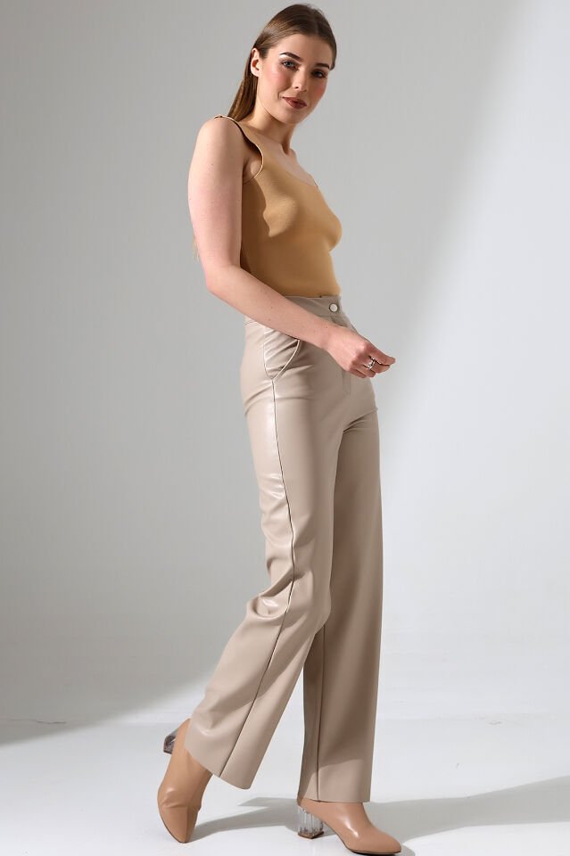 Kadın Deri Bol Paçalı Cepli Pantolon 2427 S - EKRU