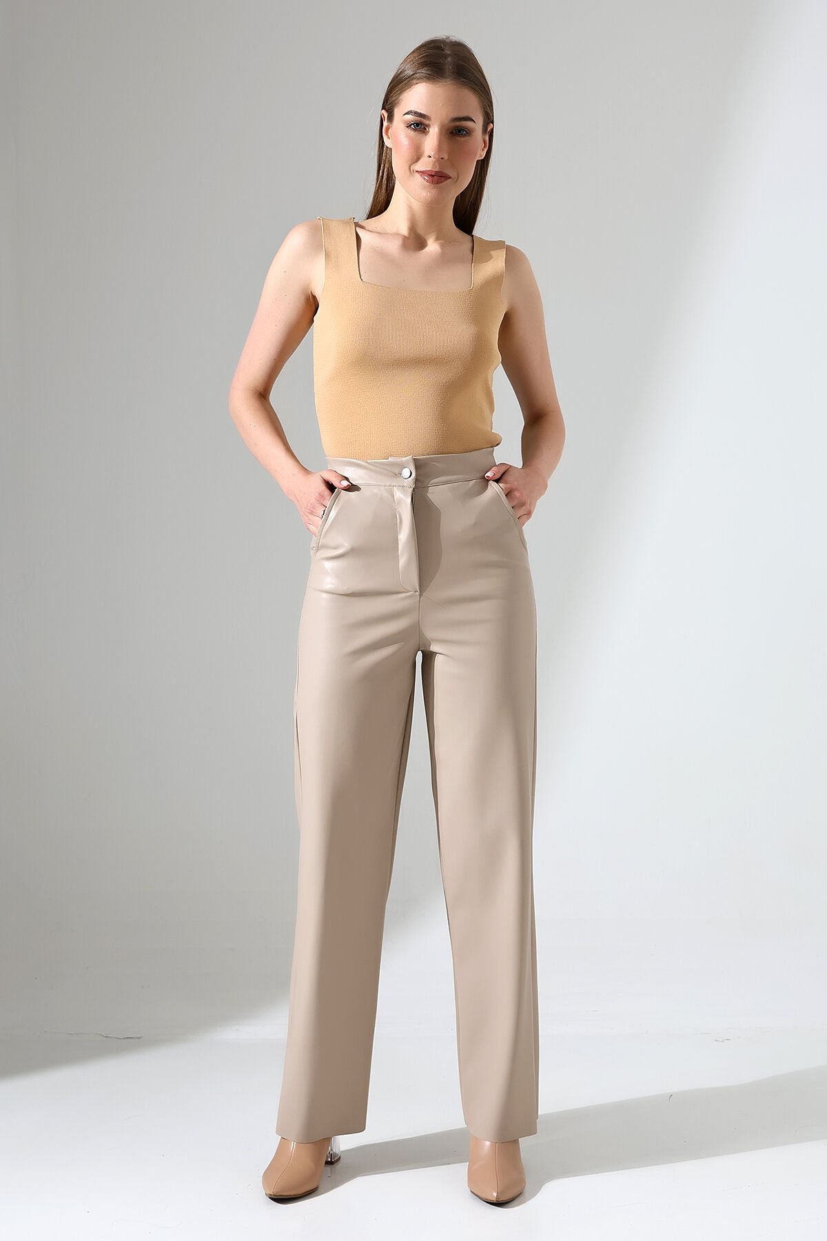 Winmoda kadın suni deri pantolon modeli, yüksek bel ve bol paça formuyla konforu ve şıklığı bir arada sunar. Düğmeli ve fermuarlı kapama detayı modern bir görünüm kazandırırken, örme kumaş yapısı vücuda esnek bir uyum sağlar. Çift cepli tasarımı işlevsellik sunarken, düz desen ve regular kalıp ile zamansız bir siluet oluşturur. %94 Polyester, %6 Likra karışımı kumaşıyla uzun ömürlü kullanım sağlar. Günlük ve şehir şıklığı kombinlerinde rahatlıkla tercih edilebilen bu pantolonun uzun ömürlü kalması için tersden elde yıkama önerilir.
