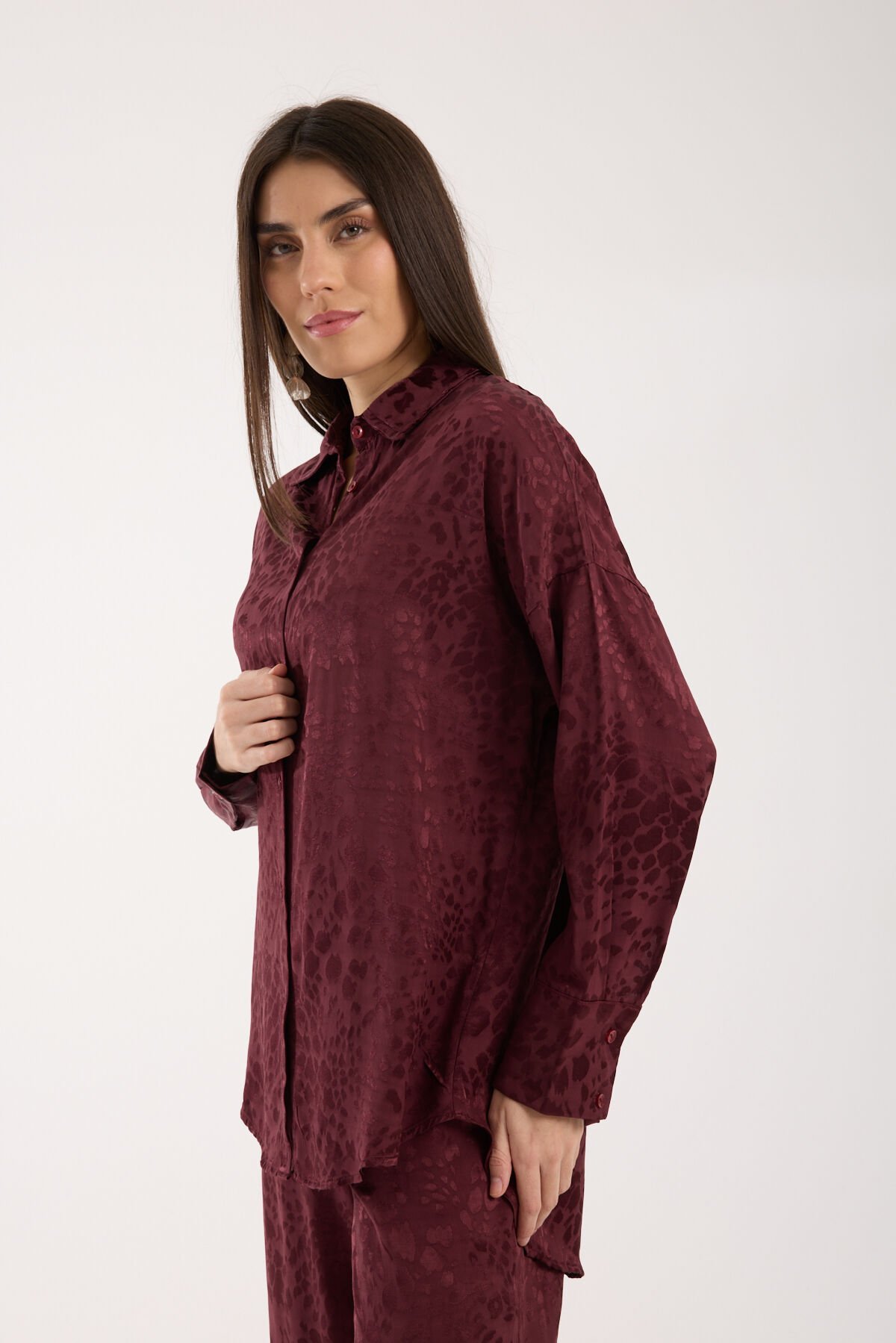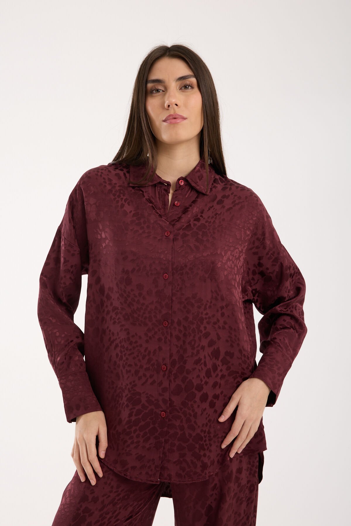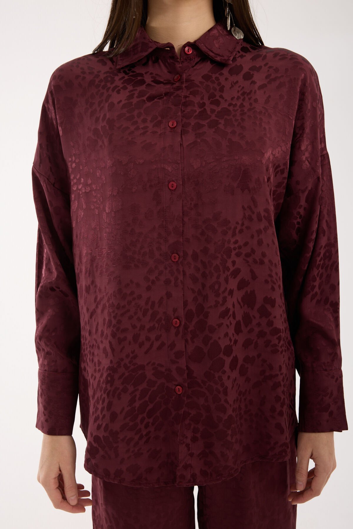 Kadın Desenli ve Dokulu Salaş Gömlek L - BORDO
