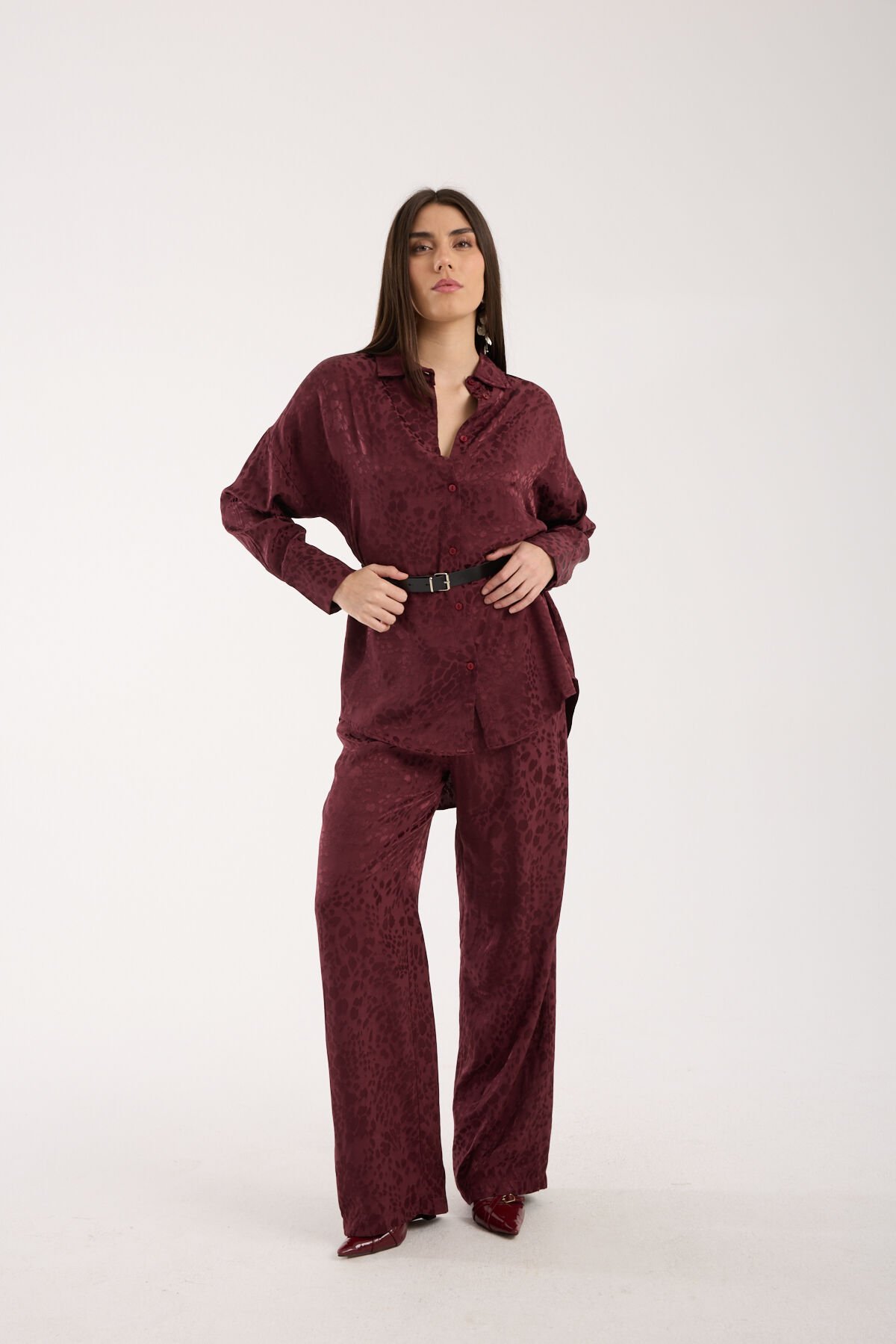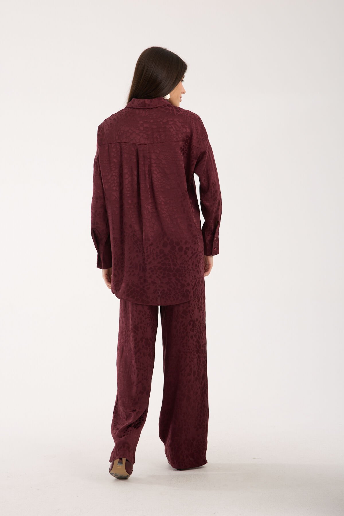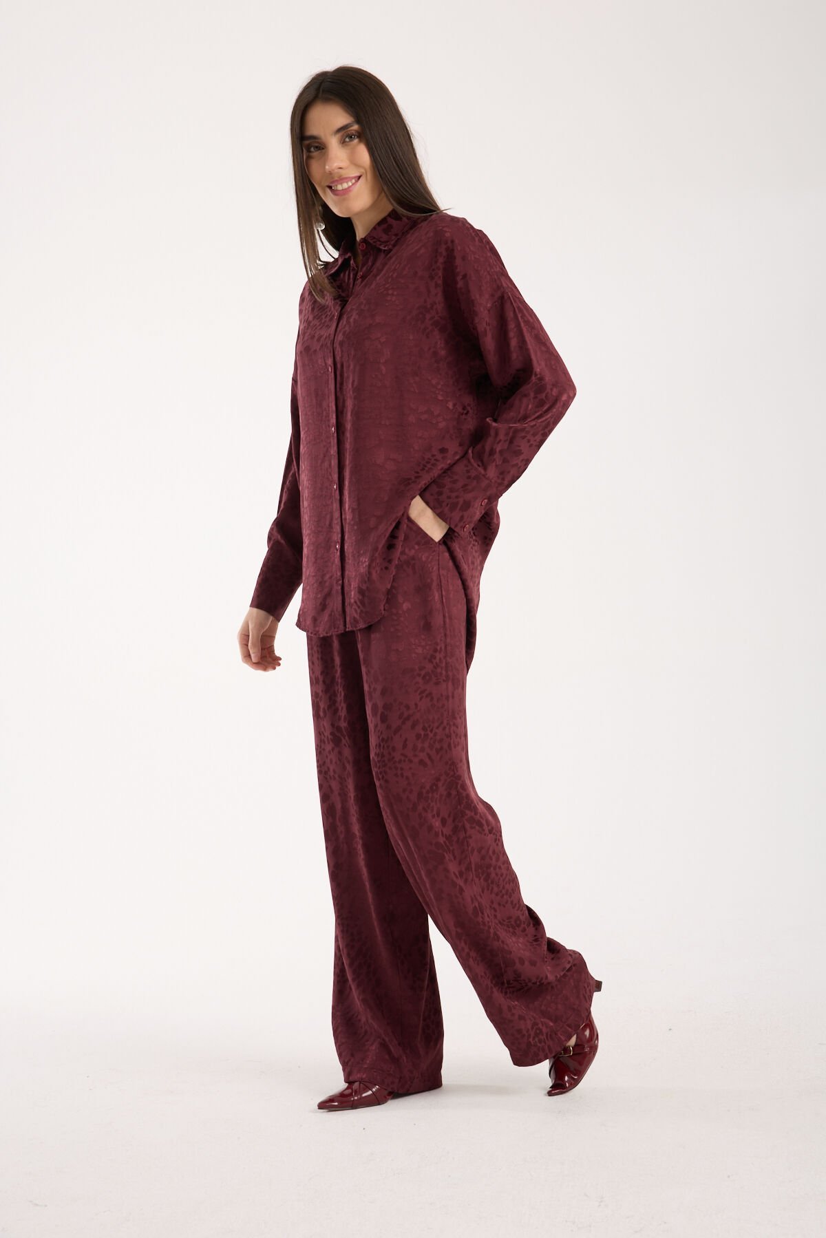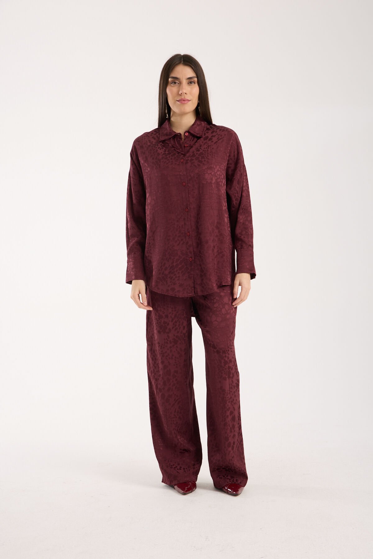 Kadın Desenli ve Dokulu Salaş Gömlek L - BORDO