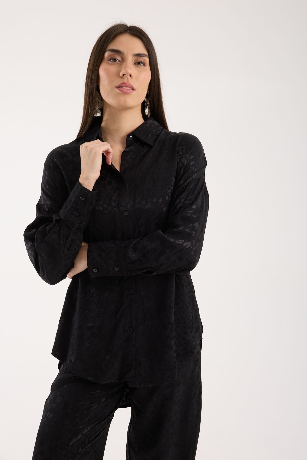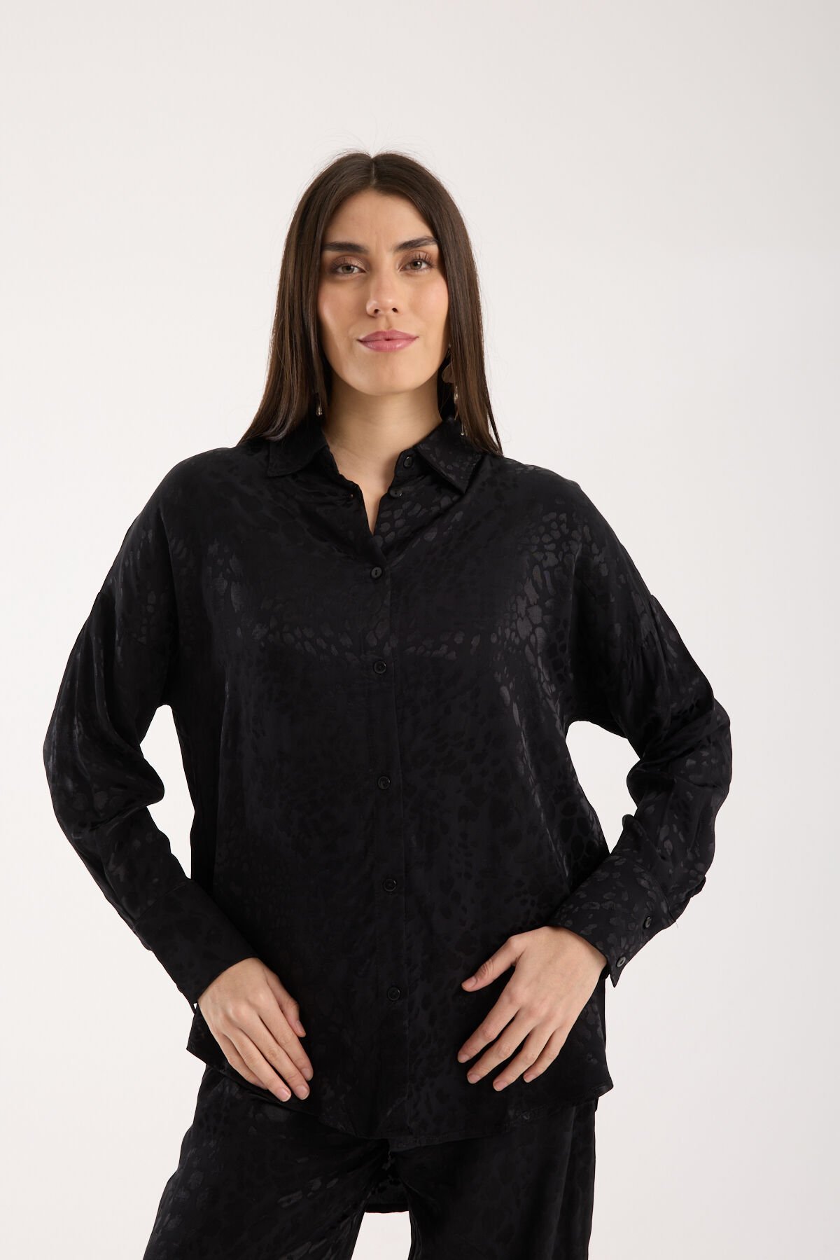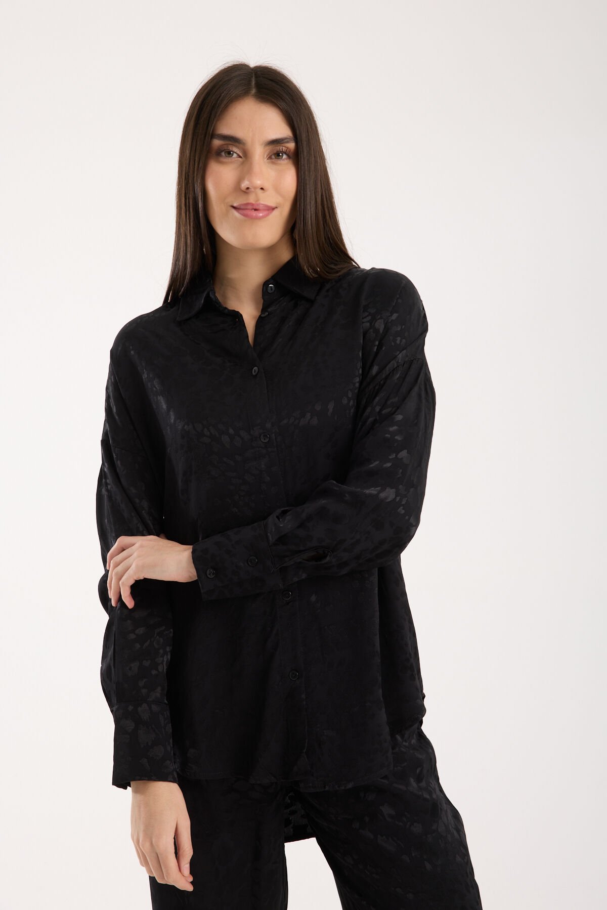 Kadın Desenli ve Dokulu Salaş Gömlek L - SİYAH