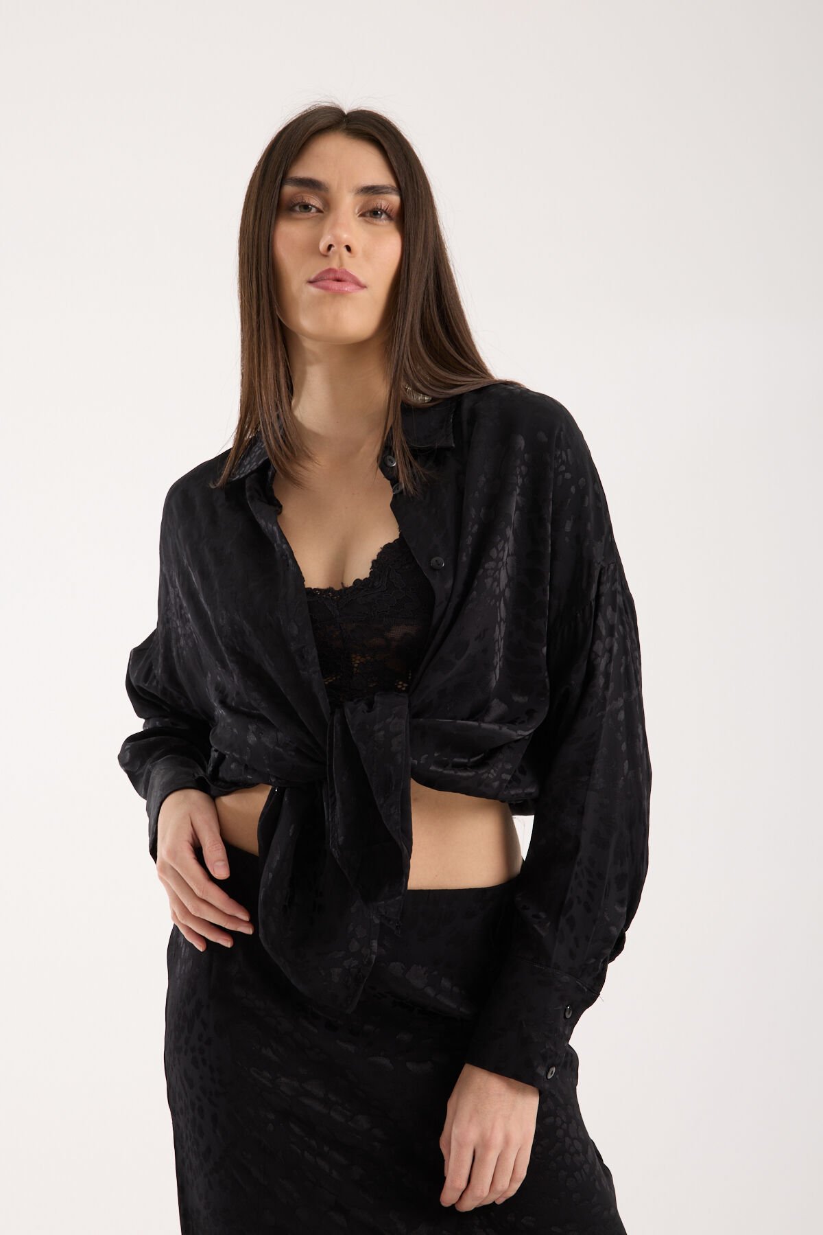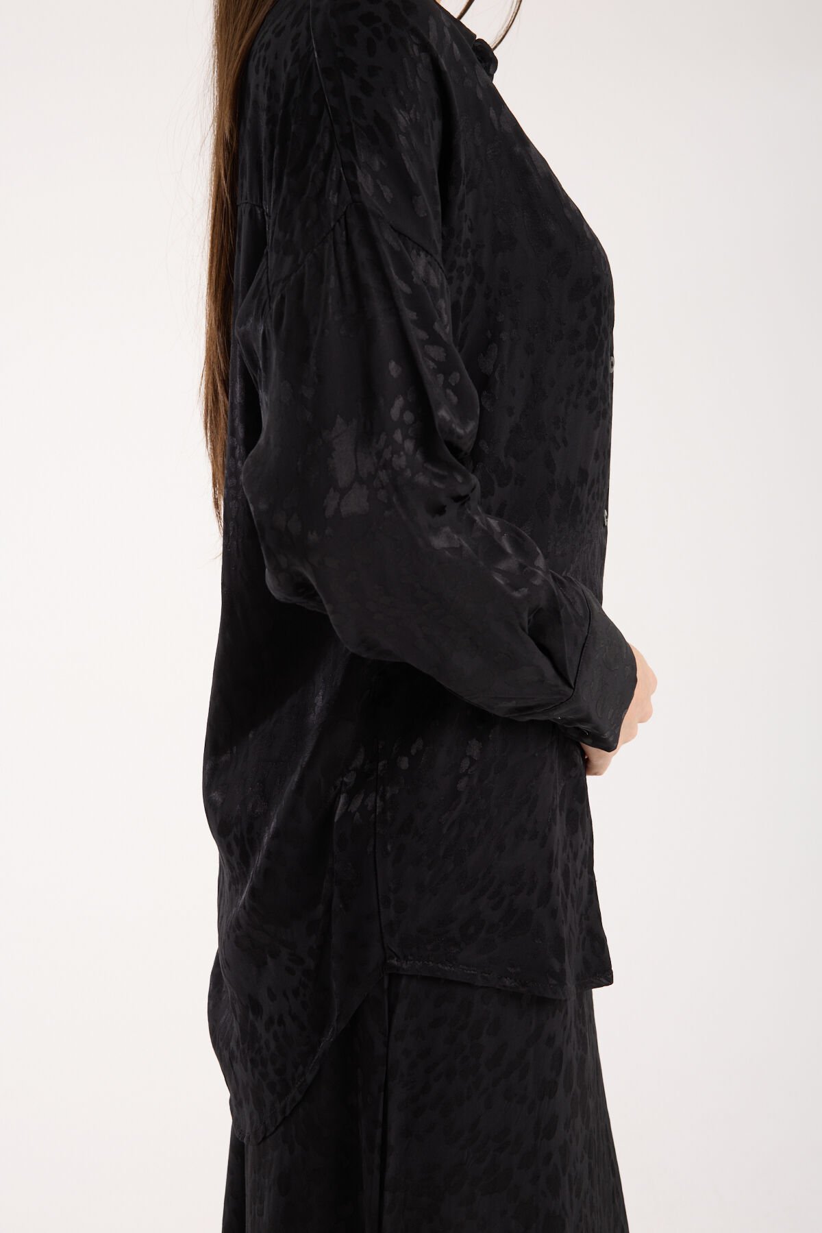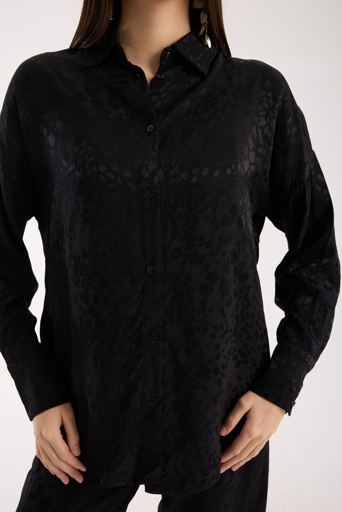 Kadın Desenli ve Dokulu Salaş Gömlek L - SİYAH