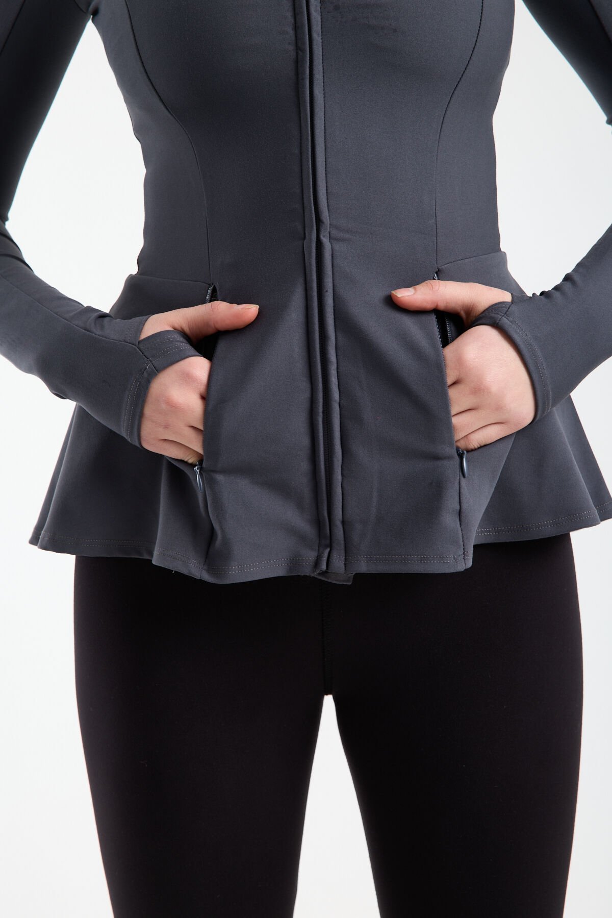 Kadın Dik Yaka Fermuarlı Volan Detaylı Esnek Spor Ceket Dokulu Kumaş 1518 2XL - KOYU GRİ